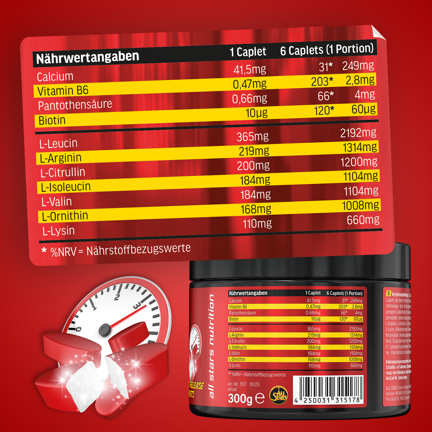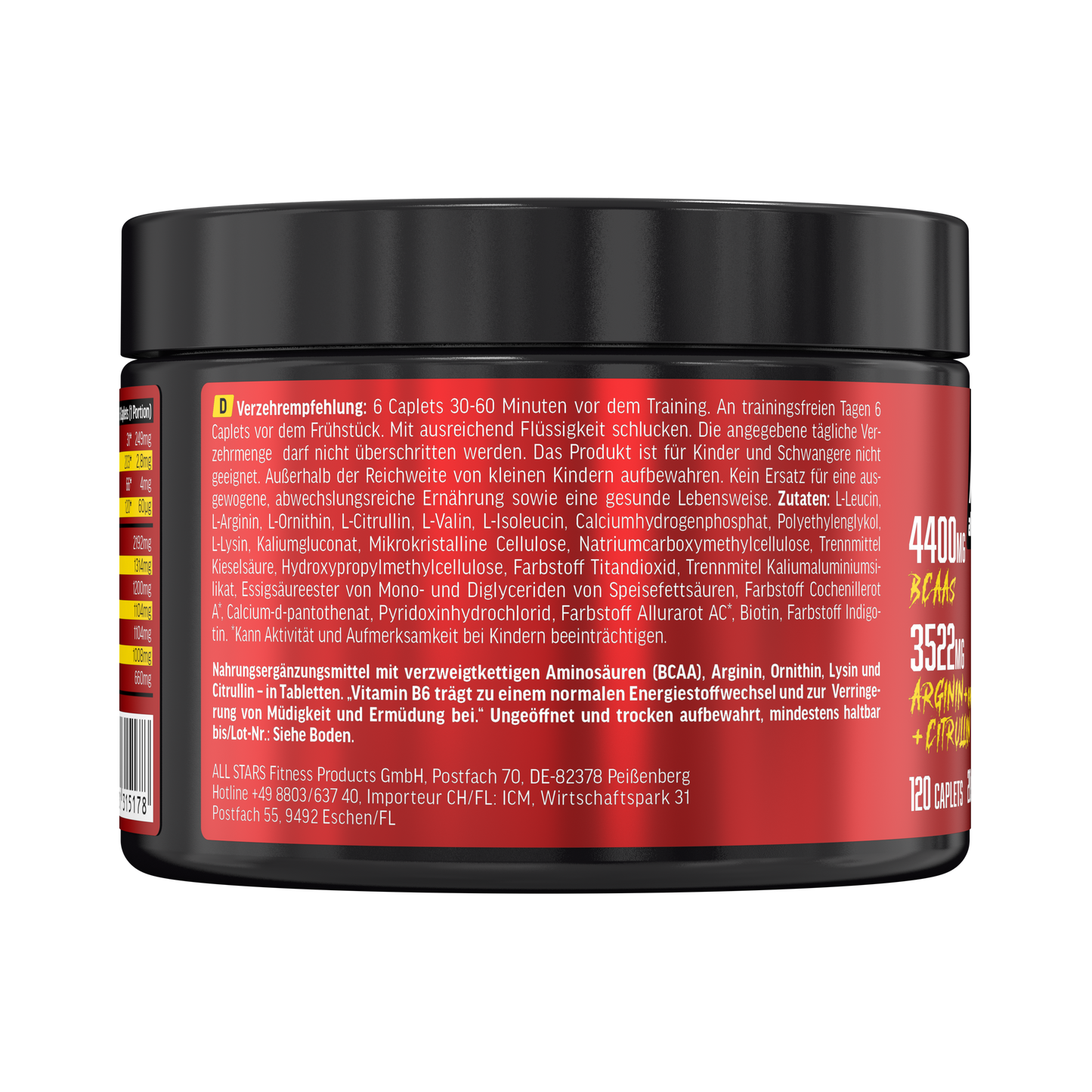 Die BCAAs (Leucin, Valin und Isoleucin) sind verzweigtkettige Aminosäuren und können vom Körper nicht selbst hergestellt werden. Daher müssen sie über die Nahrung und/oder Nahrungsergänzungsmittel zugeführt werden. Sie haben eine besondere Bedeutung für den Muskelaufbau und den Muskelerhalt und können direkt im Muskel verarbeitet werden. Daneben sind L-Arginin, L-Ornithin, L-Citrullin und L-Lysin in den Caplets enthalten. L-Arginin zählt zu den semi-essentiellen Aminosäuren. Der menschliche Organismus ist in der Lage diese Vorstufe von Stickstoffmonoxid selbst zu synthetisieren. In intensiven Trainingsphasen zum Muskelaufbau sollte jedoch auf eine ausreichende Versorgung geachtet werden, da der Bedarf die Eigenproduktion übersteigen kann.