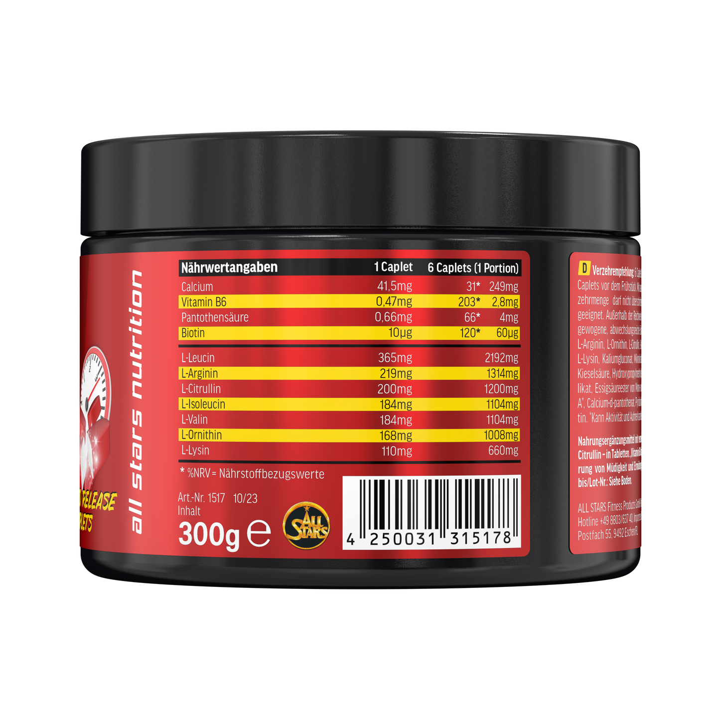Eine Portion (6 Caplets) liefert 8574mg hochwertige Aminosäuren, davon 4391mg BCAAs. Es sind weder Kohlenhydrate noch Fett enthalten. Die Rapid Release Caplets sollten rund ums Training eingenommen werden.