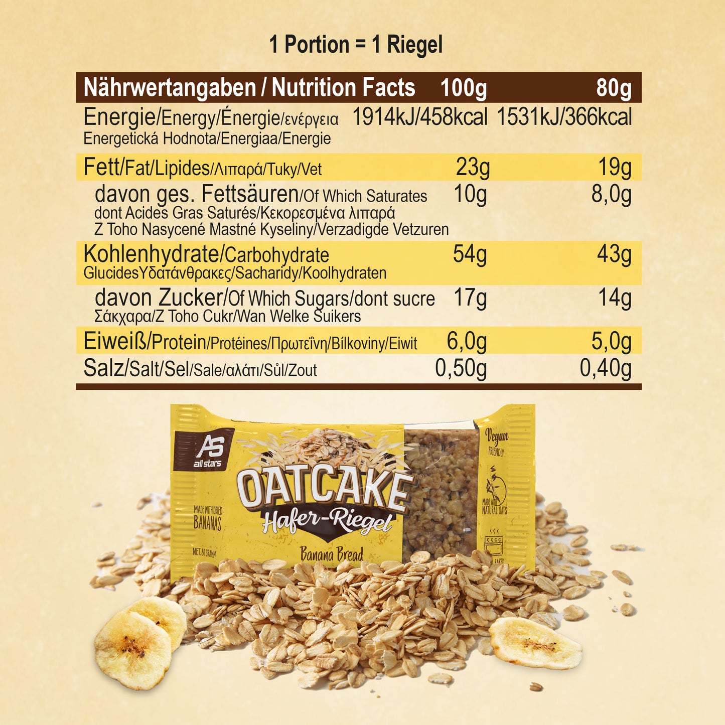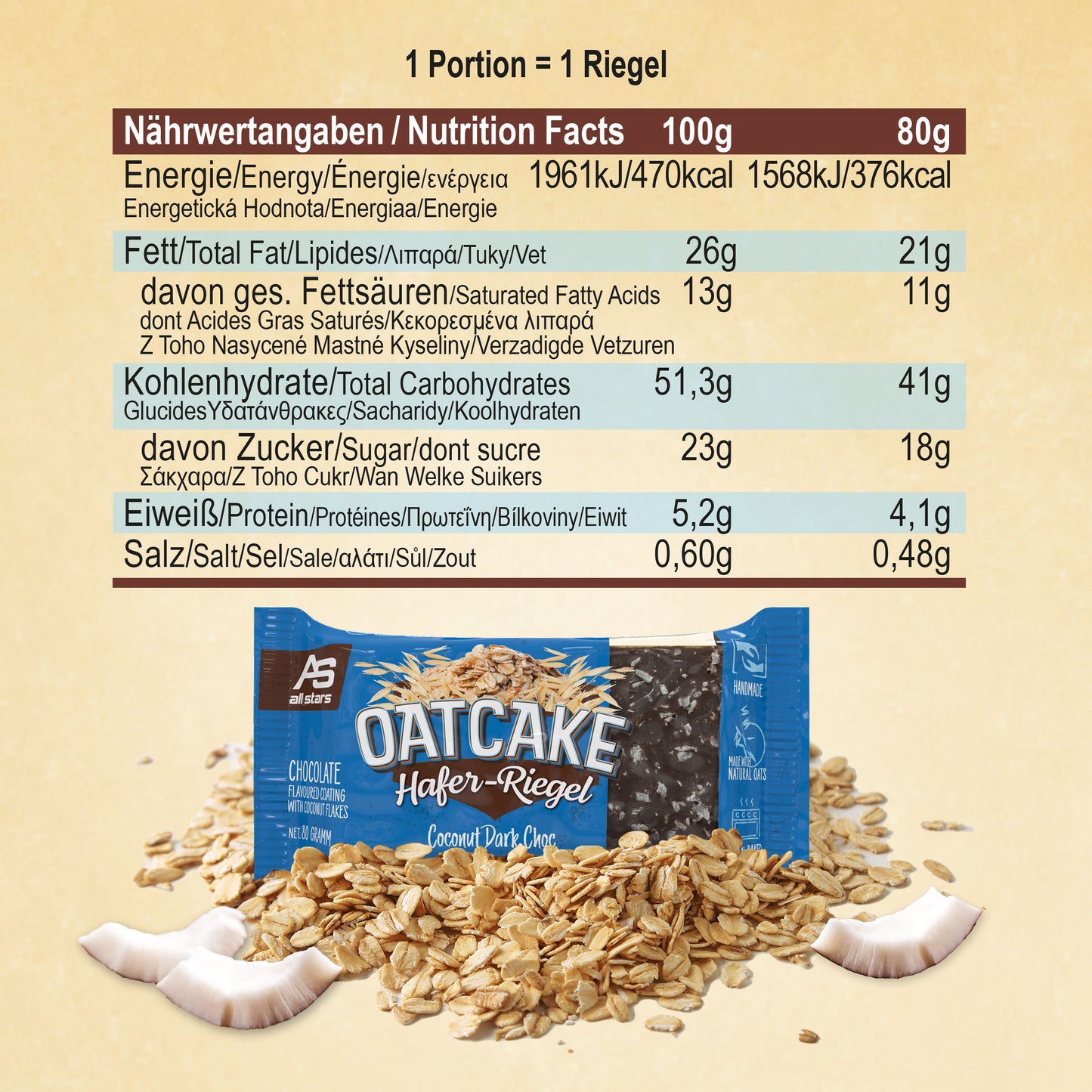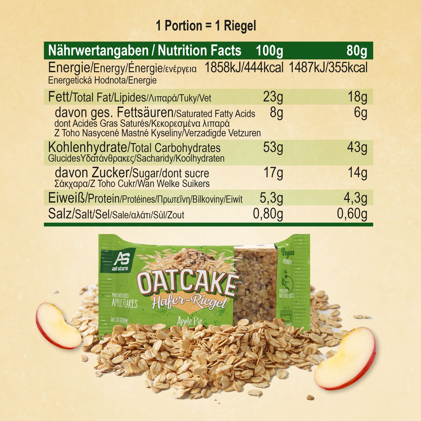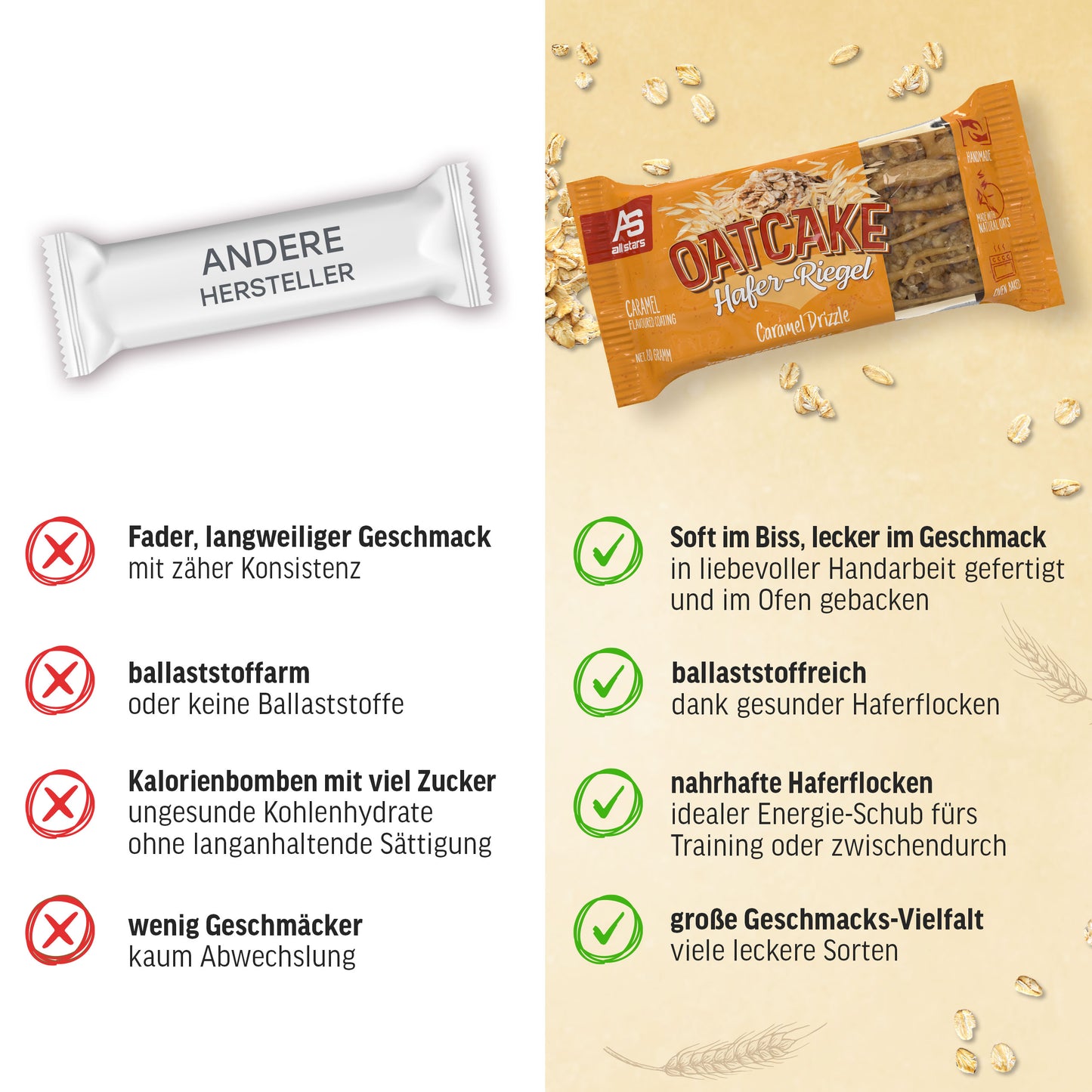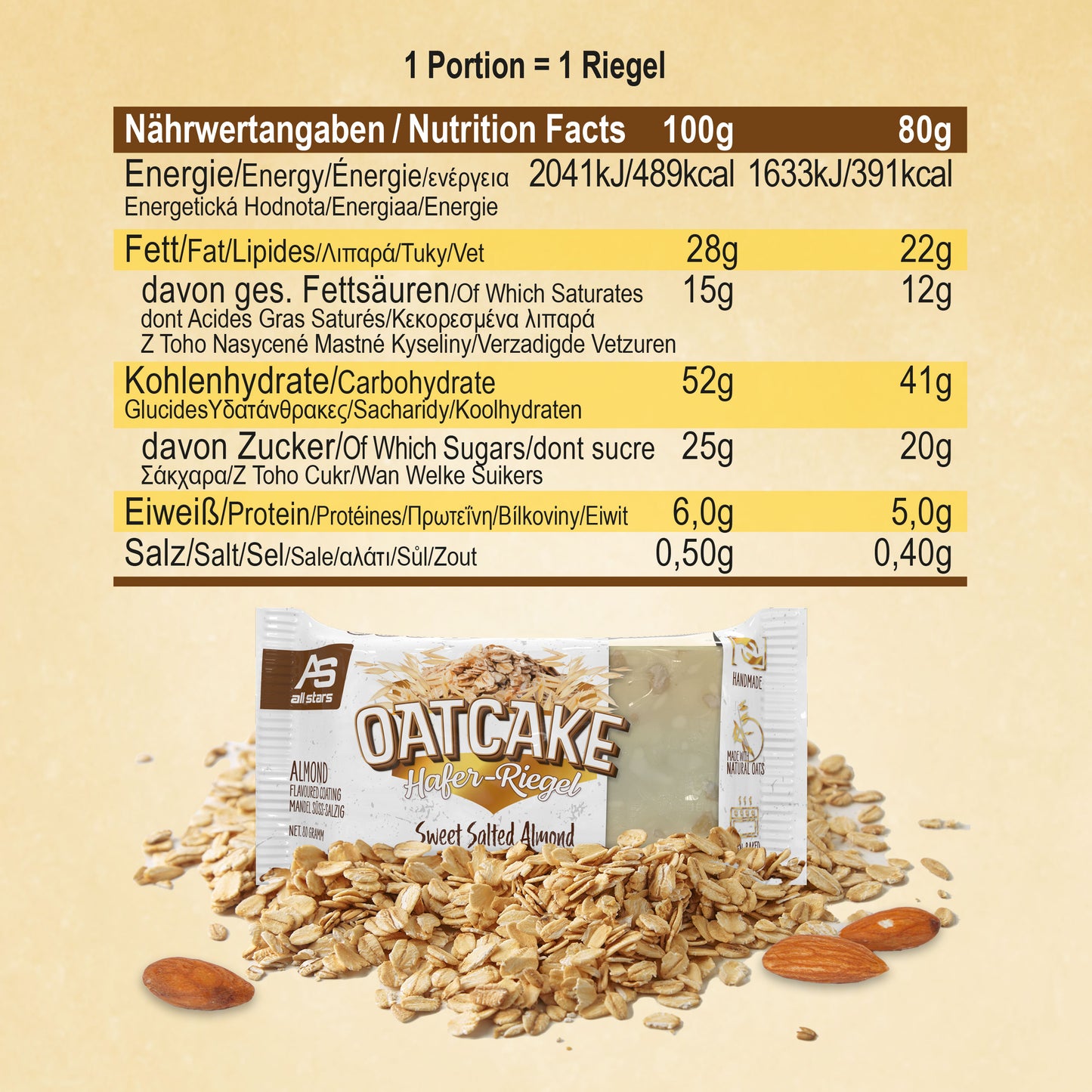 Der neue 80g Hafer-Riegel von ALL STARS ist der ideale Mahlzeitenersatz vor dem Training oder unterwegs, wenn keine Zeit für eine richtige Mahlzeit bleibt. Der OATCAKE Bar wird in liebervoller Handarbeit hergestellt und ist im Ofen gebacken.