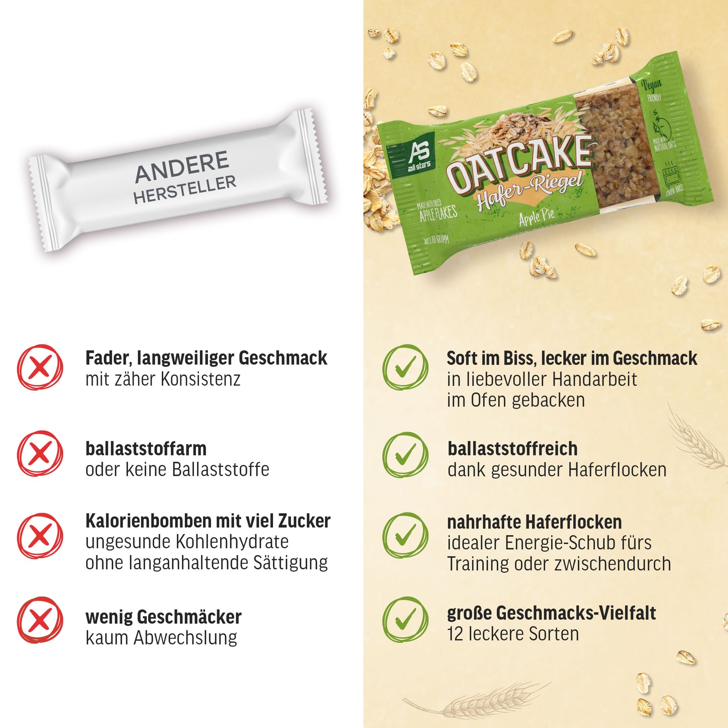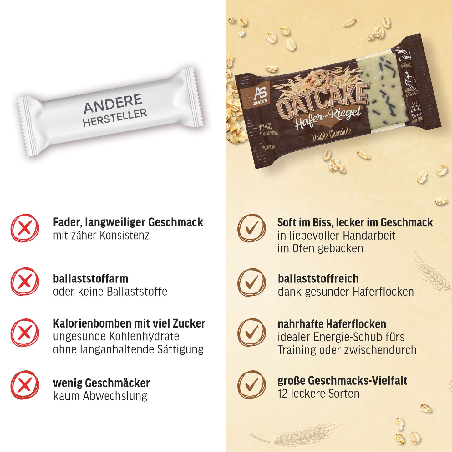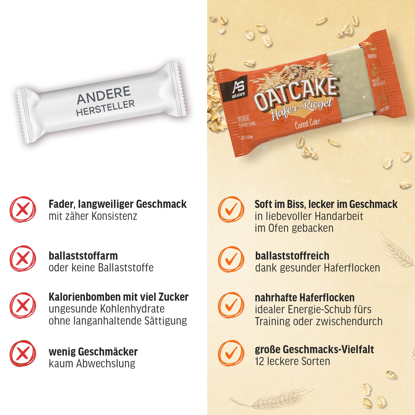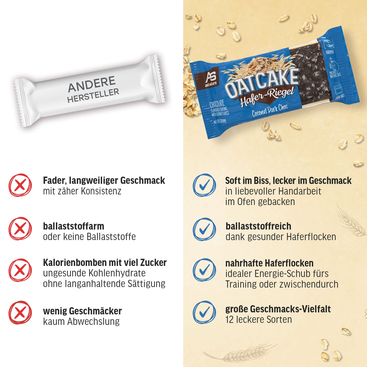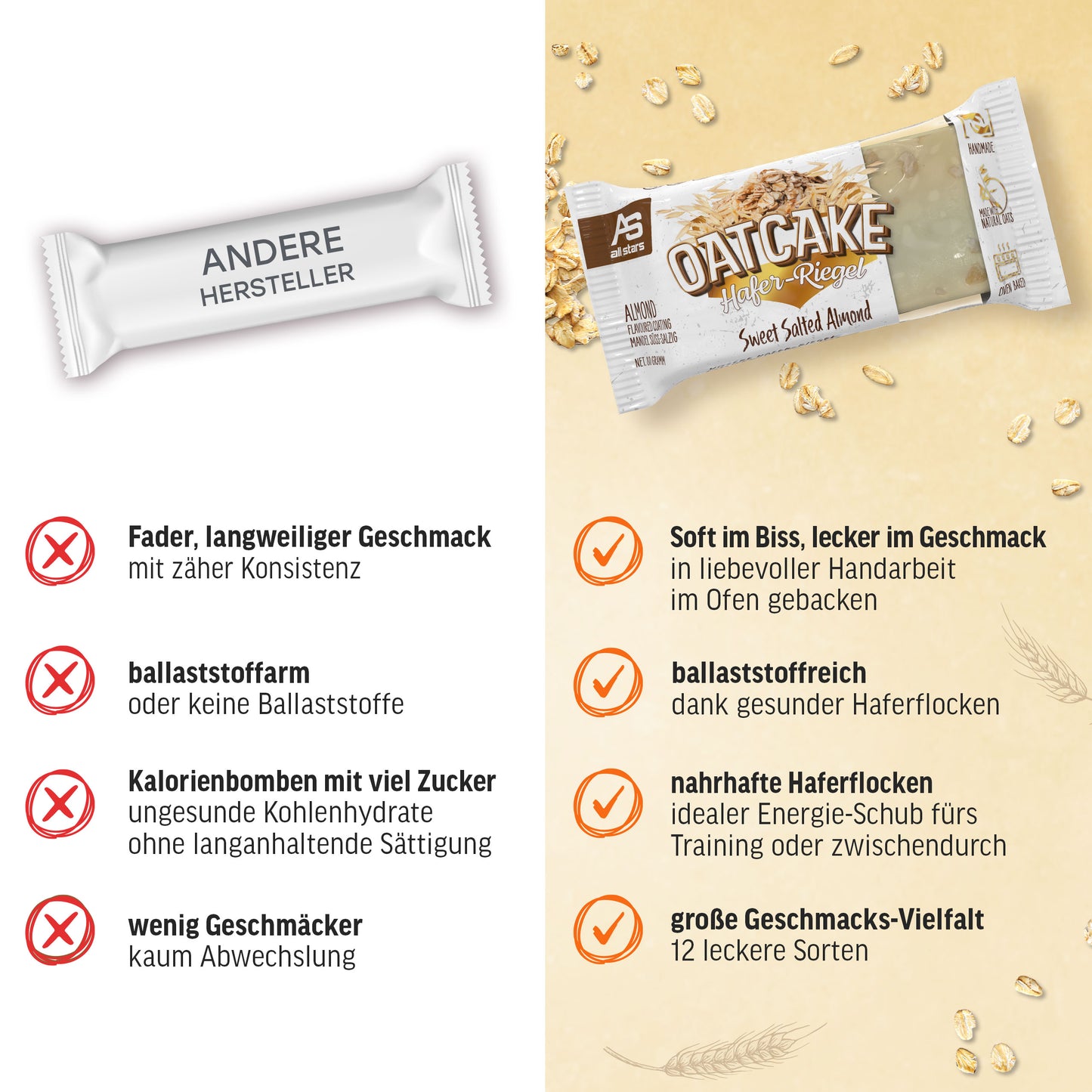 Auch in Riegelform für zwischendurch sind Haferflocken ideal. Sie liefern schnell verfügbare und auch langanhaltend Energie, sättigen gut und sind damit ein perfekter Mahlzeitenersatz für unterwegs oder vor dem Training, wenn keine Zeit für eine gesunde, ausgewogene und nährstoffreiche Mahlzeit ist oder man den Körper nicht mit einer großen Hauptmahlzeit belasten möchte. Auch nach dem Training kann der OATCAKE aufgebrauchte Energiereserven wieder auffüllen. Den neuen OATCAKE Hafer-Riegel gibt es ab sofort im 12er Display . Ideal zum Testen der 5 leckeren Geschmacksrichtungen ist unsere 12er MIX-BOX.