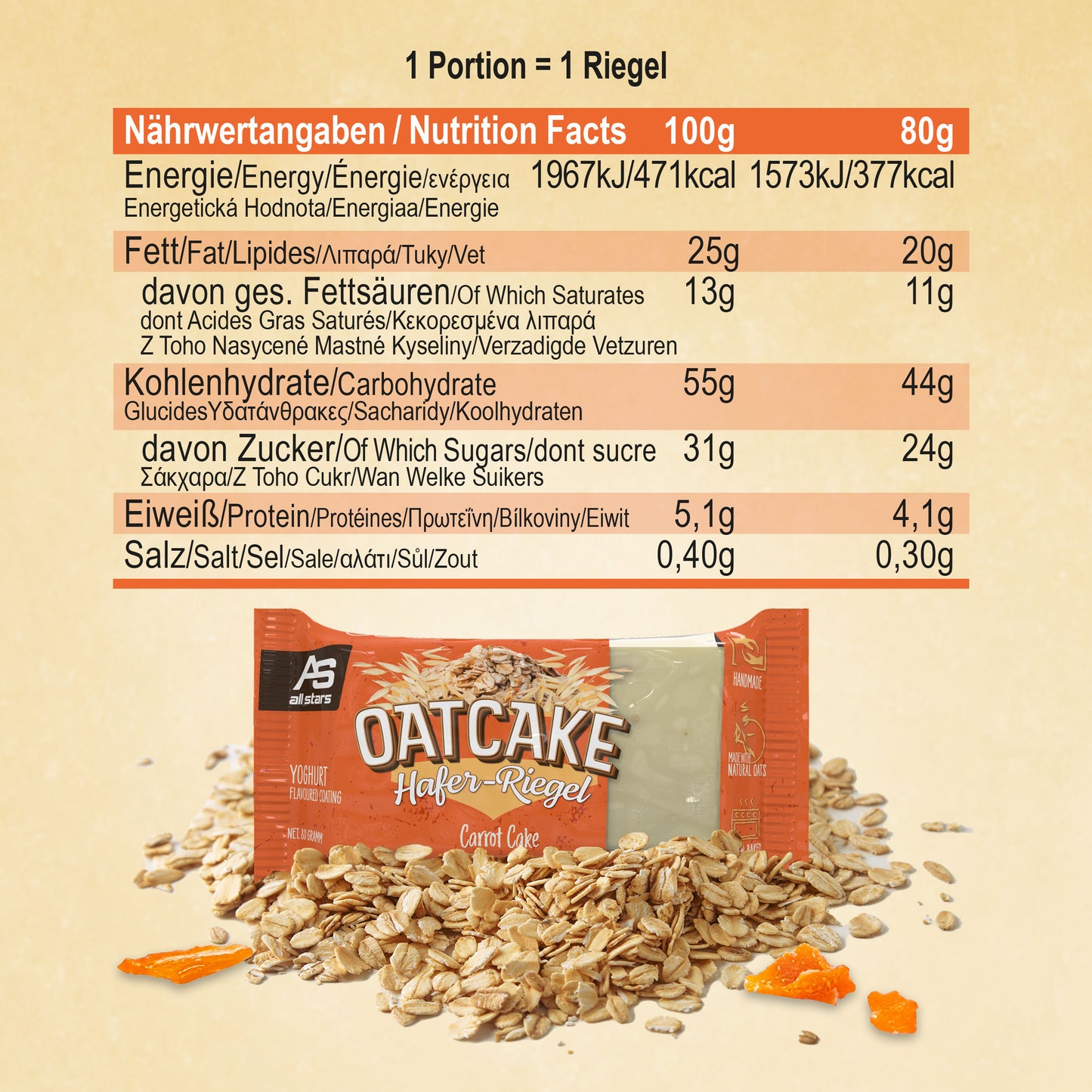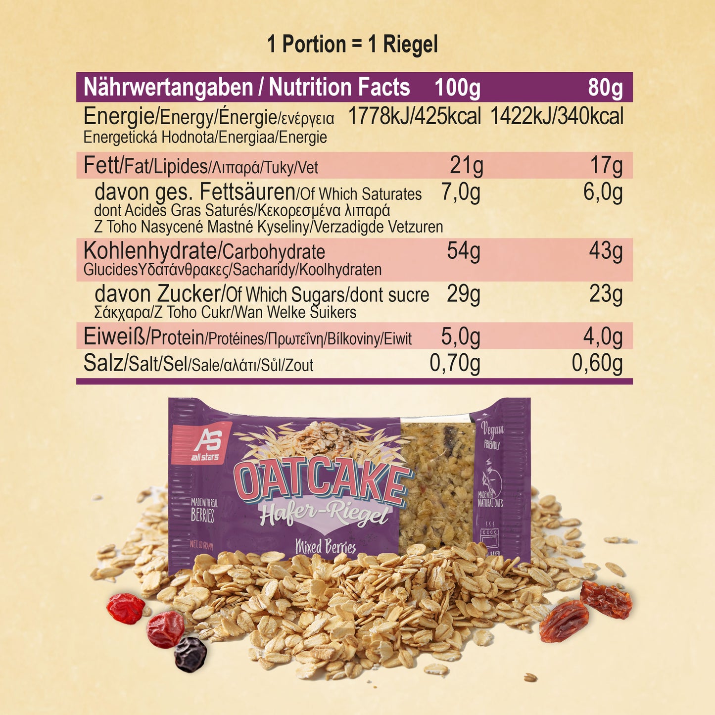 Die ALL STARS OATCAKE Riegel sind softe Hafer-Riegel für aktive Tage. Sie eignen sich als Snack im Alltag, vor oder nach dem Training sowie als kohlenhydratreiche Mahlzeit für unterwegs. Ideal, wenn wenig Zeit für eine vollwertige Mahlzeit bleibt.