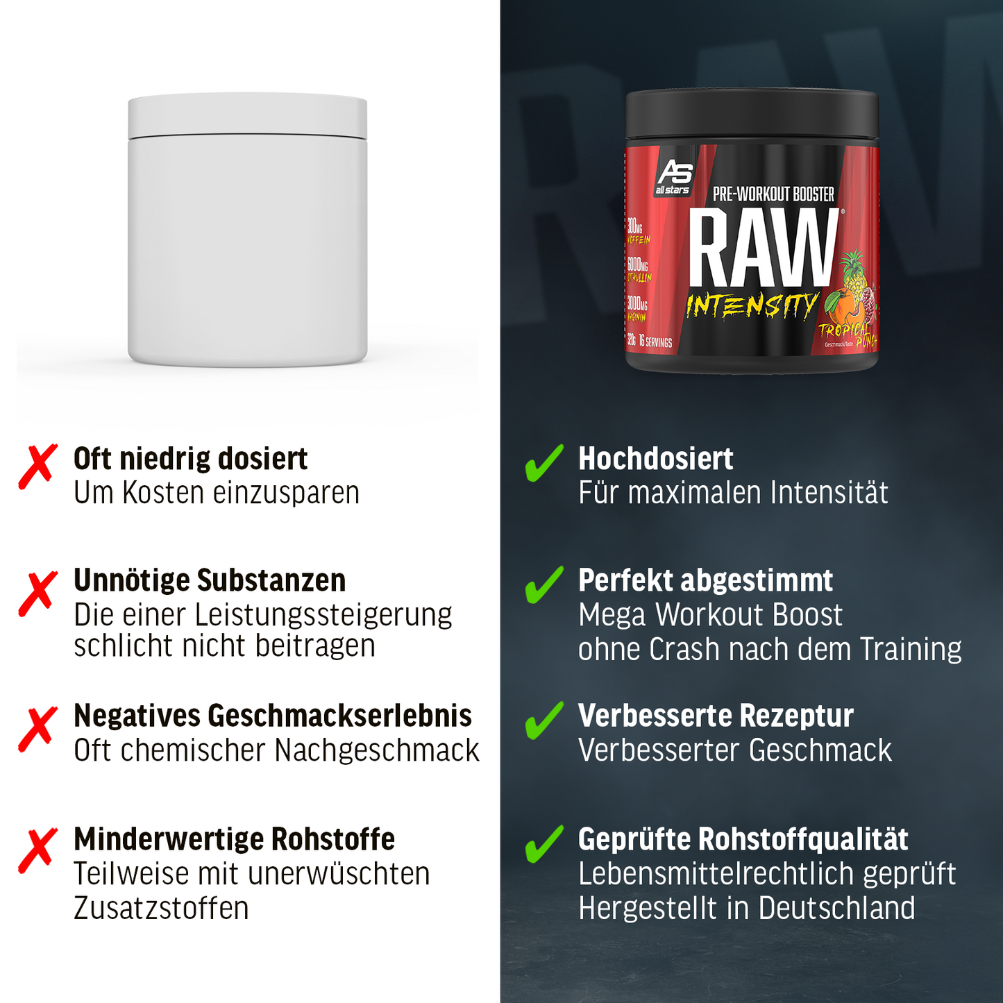 Jeder kennt es - nach einem stressigen Alltag oder am Morgen braucht man einen Kick, um sich die nötige Motivation und Konzentration für die anstehende Trainingseinheit zu holen. Die Kombination der Inhaltsstoffe unterstützt Fokus und Konzentration, liefert noch einige wichtige Inhaltsstoffe fürs Training und kann als Zusatz zur normalen Ernärung einen echten Schub für ein effetives und intensives Workout bringen. Hol alles aus Dir raus und bring Dich auf ein neues Level - mit dem neuen RAW Intensity Pre Workout Booster
