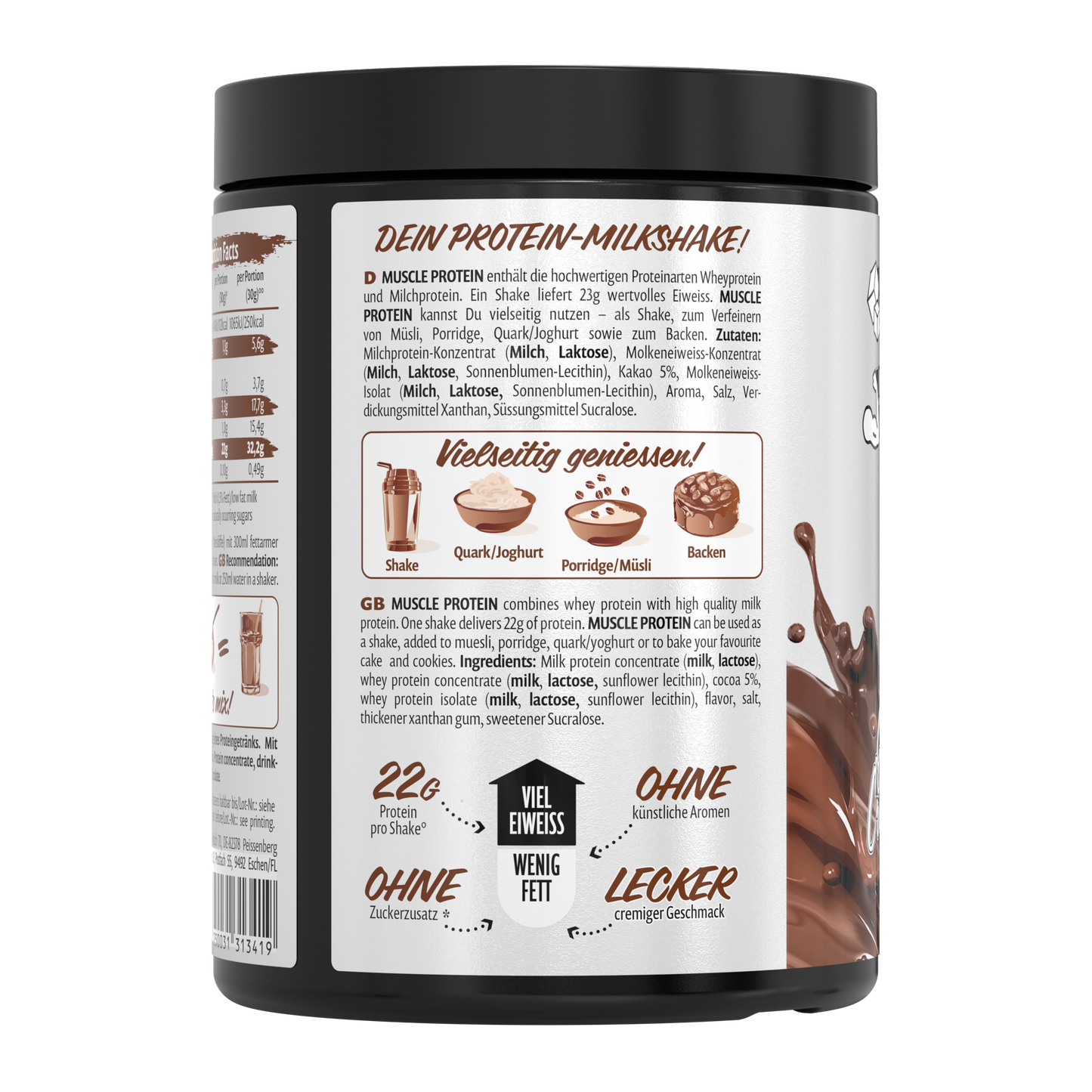 Die MUSCLE PROTEIN Shakes sind herrlich cremig und superlecker, bieten also beste Voraussetzungen für genussvolle Proteinzusätze über den Tag verteilt. Egal ob Du sie als klassischen Shake am Morgen oder rund ums Training, als Zusatz zum Frühstück oder Dessert oder das Pulver im Sonntagskuchen als Proteinlieferant einsetzen möchtest. Probier’s aus und lass es Dir schmecken!