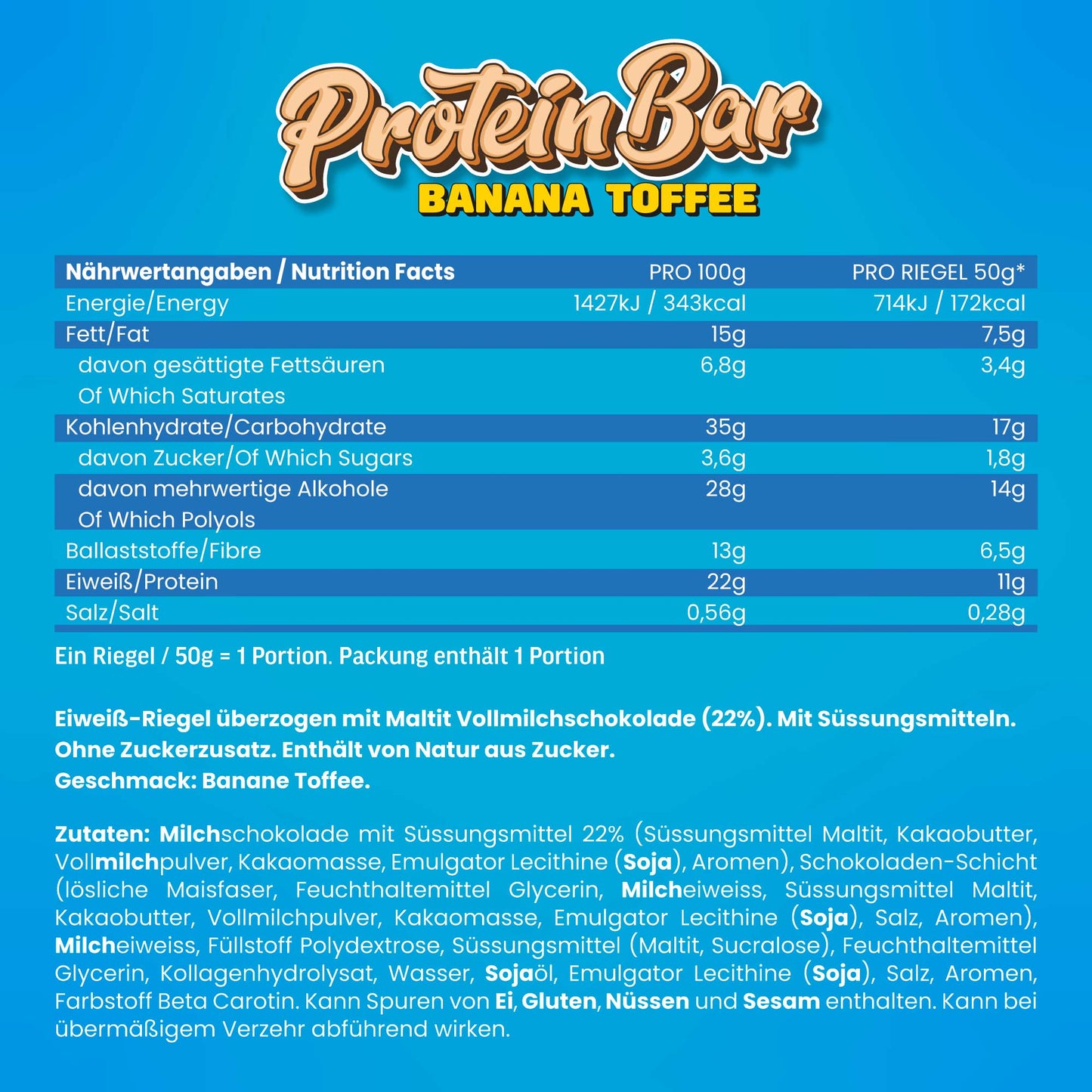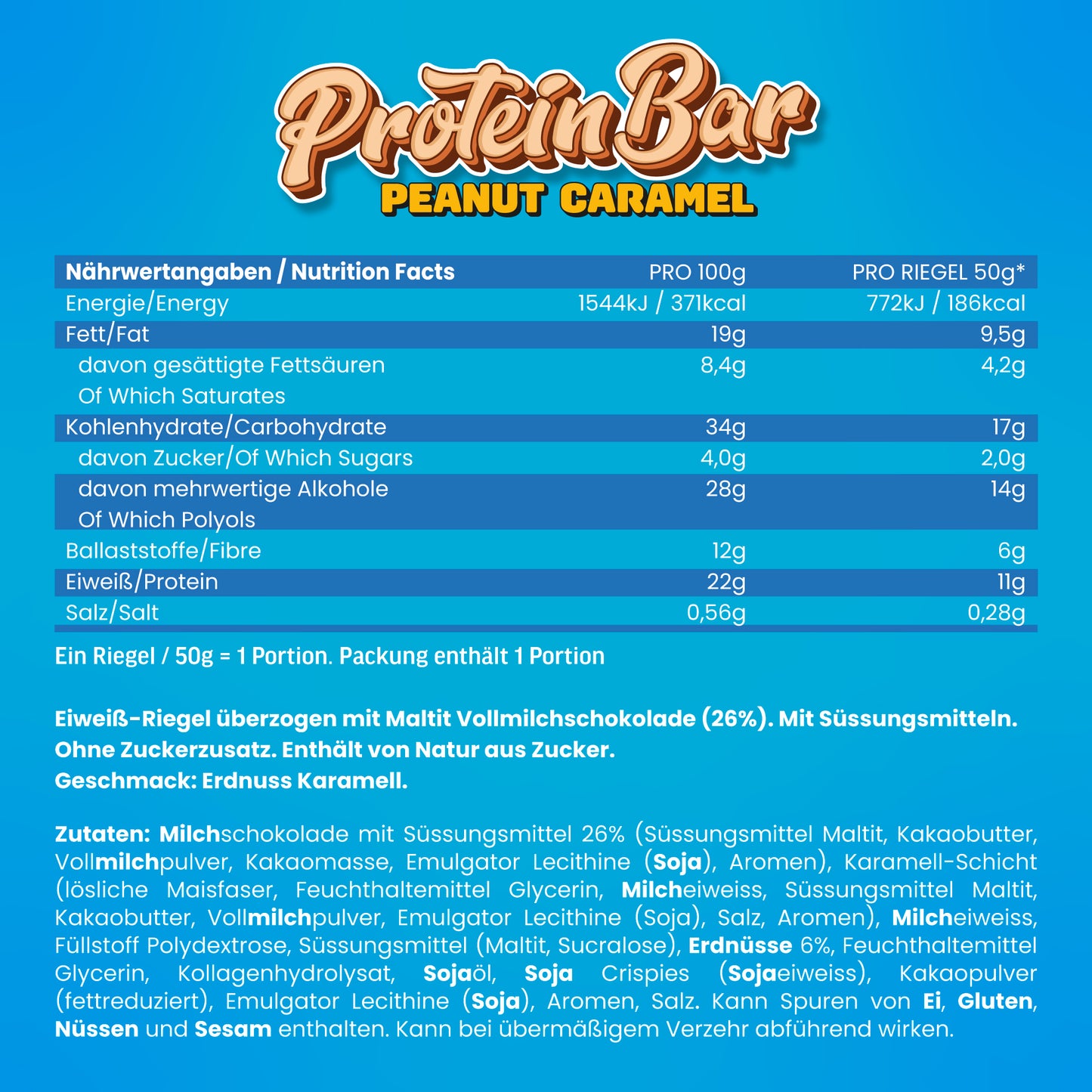 | Durchschnittliche Nährwerte | Pro 100g | Pro Riegel (50g) |