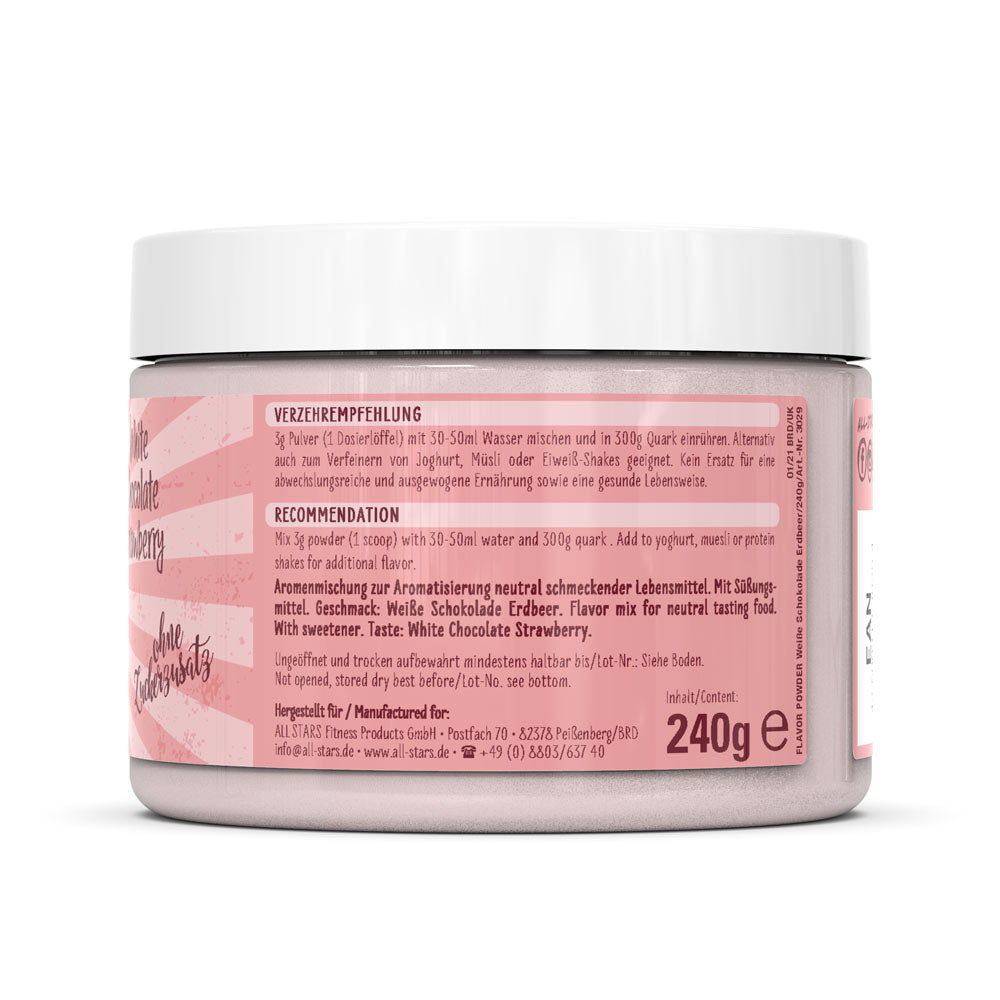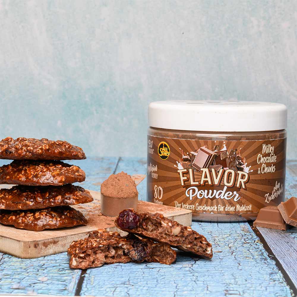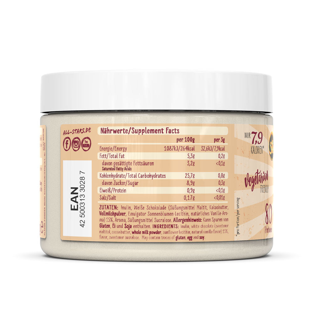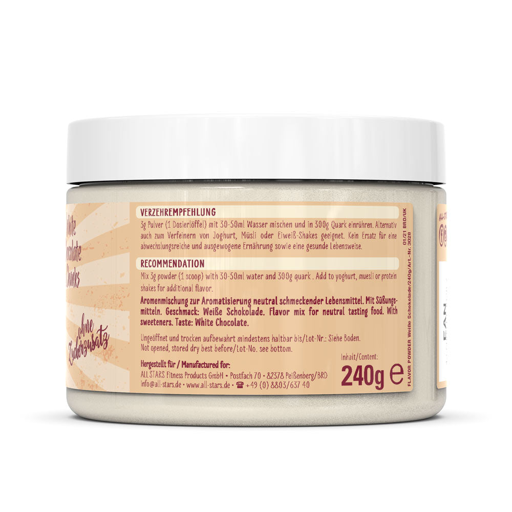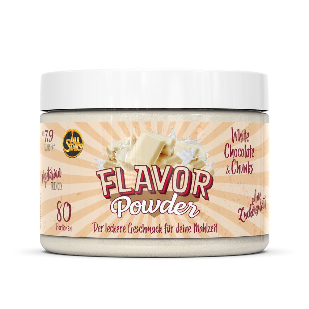 Das Flavor Powder in den drei leckeren Geschmacksvarianten White Chocolate Strawberry, Milky Chocolate & Chunks und White Chocolate & Chunks sorgt vielfältig für kalorienarme, geschmackliche Abwechslung und zusätzliche Cremigkeit gerade bei fettarmen Produkten. Zudem erhöht das Pulver den Ballaststoffanteil und kann perfekt zu neutral schmeckenden Milchprodukten, dem morgendlichen Müsli oder dem Protein Shake zugefügt werden. Auch beim Backen kann das Flavor Powder als Zusatz zum Mehl kalorienarm für Geschmack und Süße sorgen. Verwendet wird es häufig in Diätphasen zur Reduktion des Fett- und Zuckeranteils der normalen Ernährung, kann aber auch in alle anderen Ernährungsgewohnheiten integriert werden und für geschmackliche Abwechslung sorgen. ALL STARS Flavor Powder – der leckere Geschmack für Deine Mahlzeit. Probier’s einfach aus und überzeug Dich selbst.