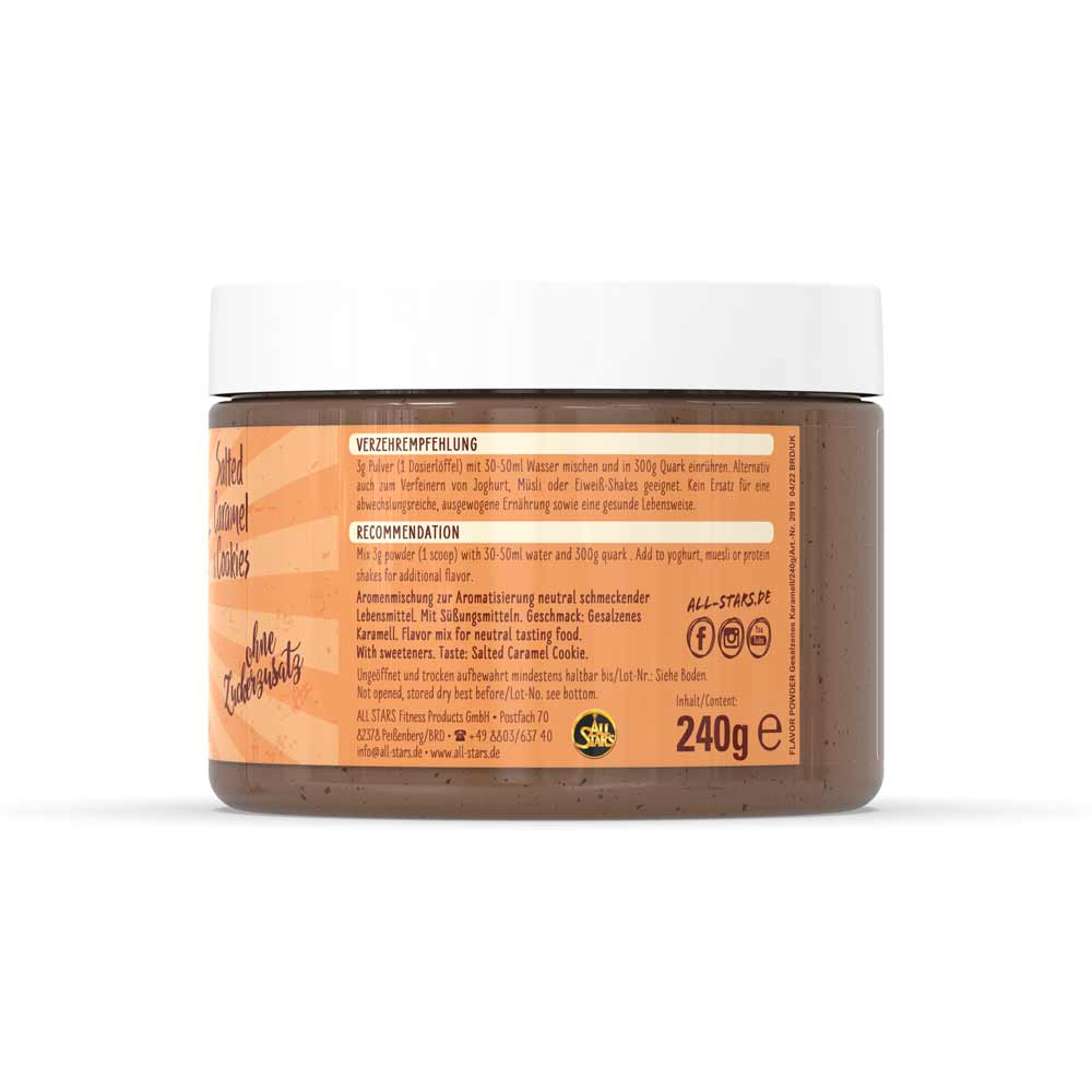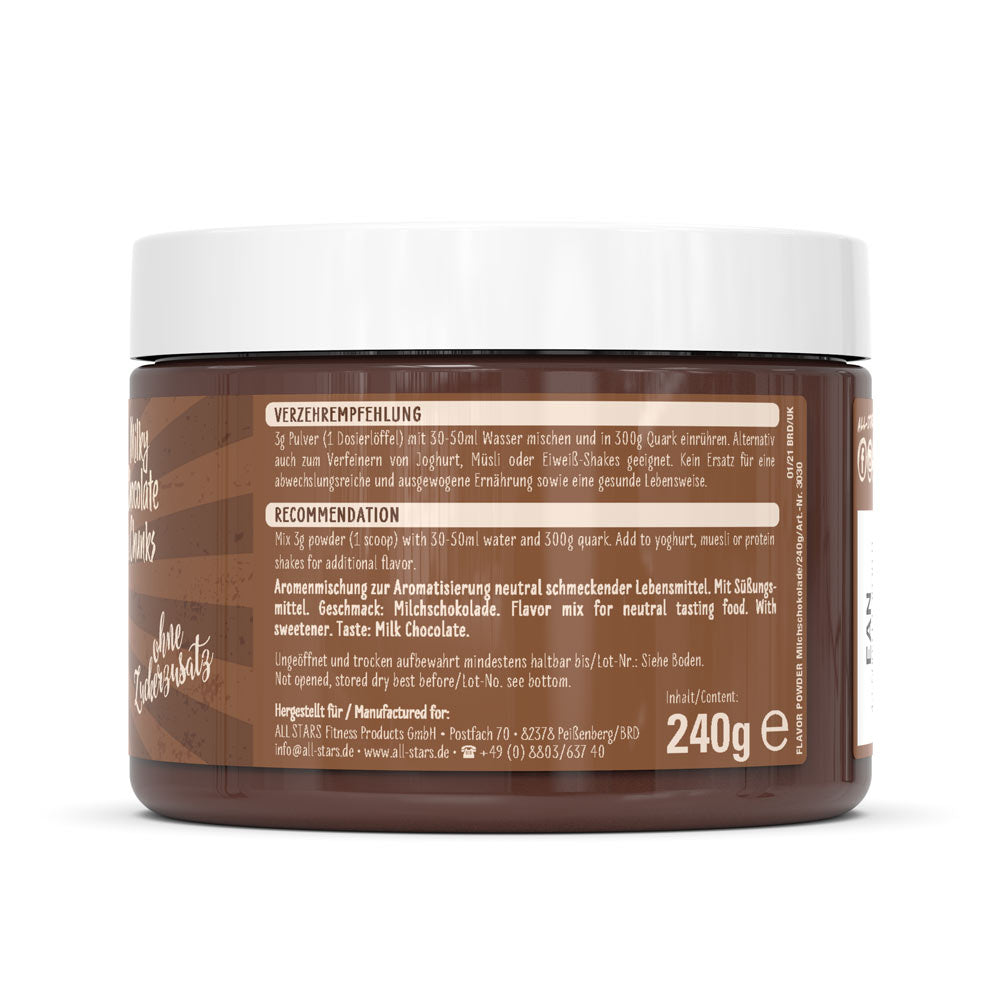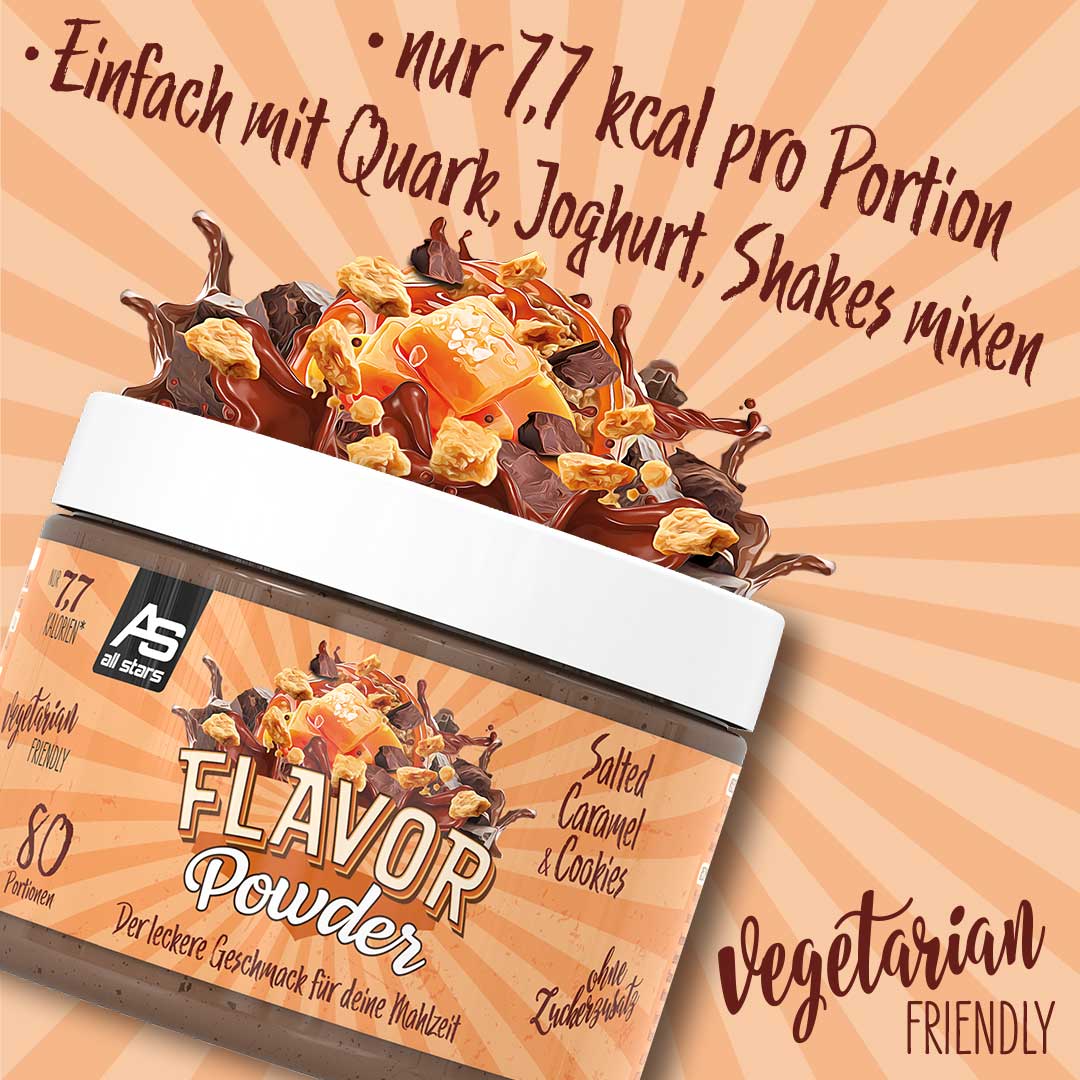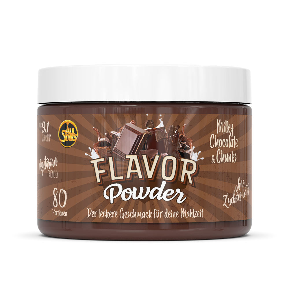Das Flavor Powder in den drei leckeren Geschmacksvarianten White Chocolate Strawberry, Milky Chocolate & Chunks und White Chocolate & Chunks sorgt vielfältig für kalorienarme, geschmackliche Abwechslung und zusätzliche Cremigkeit gerade bei fettarmen Produkten. Zudem erhöht das Pulver den Ballaststoffanteil und kann perfekt zu neutral schmeckenden Milchprodukten, dem morgendlichen Müsli oder dem Protein Shake zugefügt werden. Auch beim Backen kann das Flavor Powder als Zusatz zum Mehl kalorienarm für Geschmack und Süße sorgen. Verwendet wird es häufig in Diätphasen zur Reduktion des Fett- und Zuckeranteils der normalen Ernährung, kann aber auch in alle anderen Ernährungsgewohnheiten integriert werden und für geschmackliche Abwechslung sorgen. ALL STARS Flavor Powder – der leckere Geschmack für Deine Mahlzeit. Probier’s einfach aus und überzeug Dich selbst.