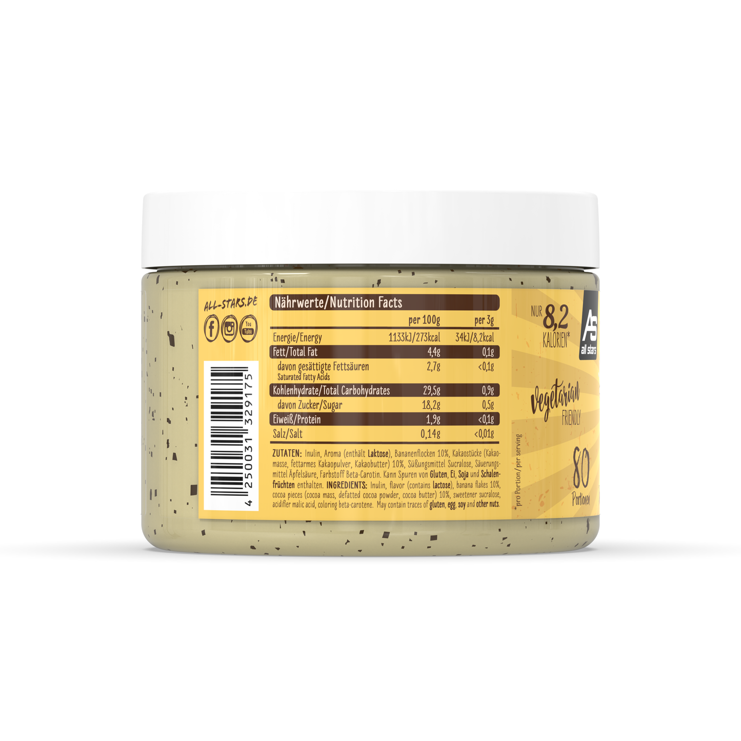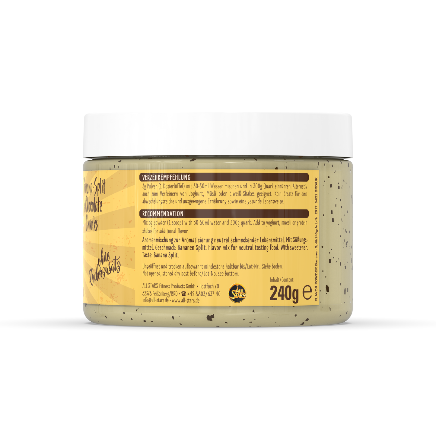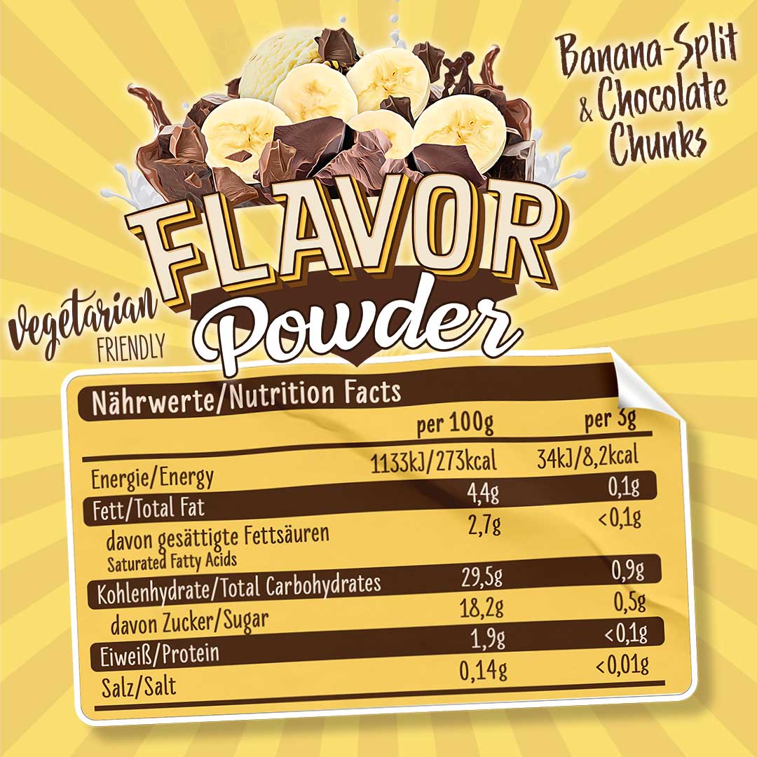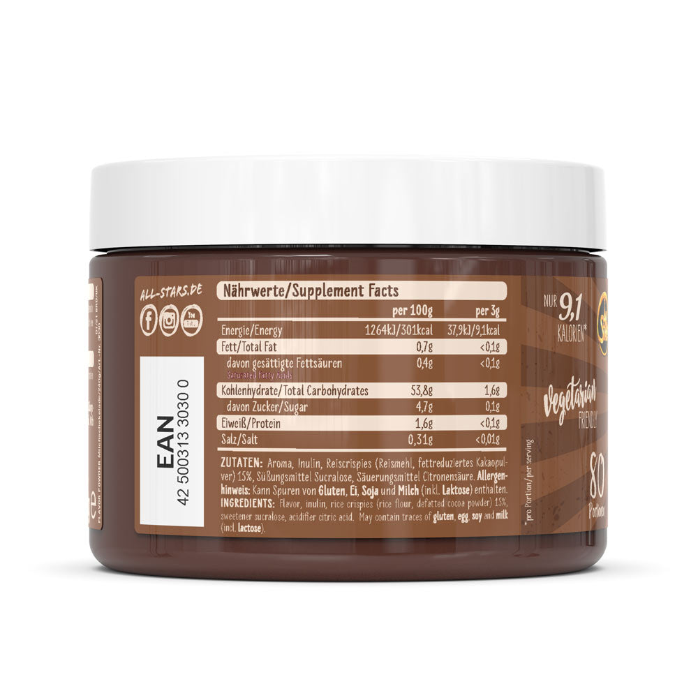 Das Flavor Powder in den drei leckeren Geschmacksvarianten White Chocolate Strawberry, Milky Chocolate & Chunks und White Chocolate & Chunks sorgt vielfältig für kalorienarme, geschmackliche Abwechslung und zusätzliche Cremigkeit gerade bei fettarmen Produkten. Zudem erhöht das Pulver den Ballaststoffanteil und kann perfekt zu neutral schmeckenden Milchprodukten, dem morgendlichen Müsli oder dem Protein Shake zugefügt werden. Auch beim Backen kann das Flavor Powder als Zusatz zum Mehl kalorienarm für Geschmack und Süße sorgen. Verwendet wird es häufig in Diätphasen zur Reduktion des Fett- und Zuckeranteils der normalen Ernährung, kann aber auch in alle anderen Ernährungsgewohnheiten integriert werden und für geschmackliche Abwechslung sorgen. ALL STARS Flavor Powder – der leckere Geschmack für Deine Mahlzeit. Probier’s einfach aus und überzeug Dich selbst.