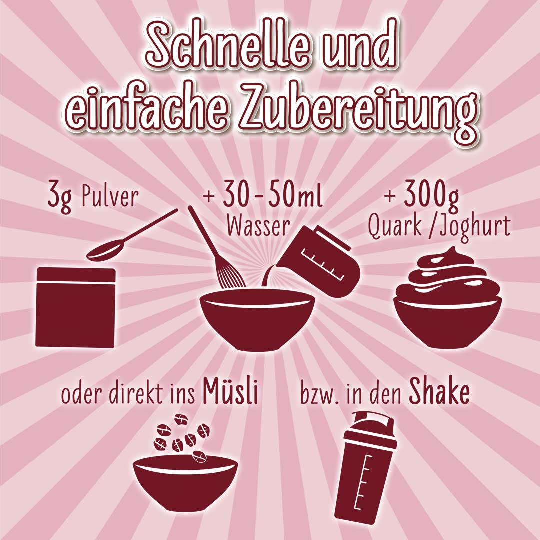 3g Pulver (1 Dosierlöffel) mit 30-50ml Wasser mischen und in 300g Quark einrühren. Alternativ auch zum Verfeinern von Joghurt, Müsli oder Eiweiß-Shakes geeignet.