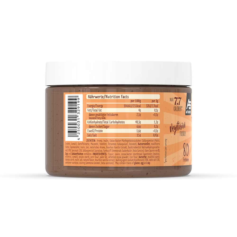 Je 3g Pulver (1 Dosierlöffel) sind maximal 0,2g Fett und höchstens 0,4g Zucker enthalten. Zusätzlich zum Süßstoff wird kein Zucker zugesetzt. Durch die geringen Fett- und Zuckermengen enthält eine Portion weniger als 10 Kalorien auf. Die 240g Dose liefert 80 Portionen.