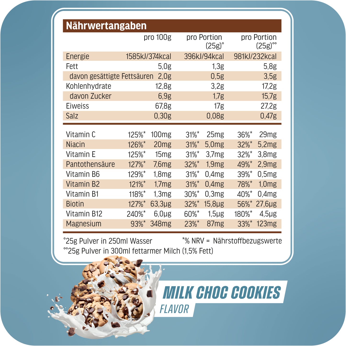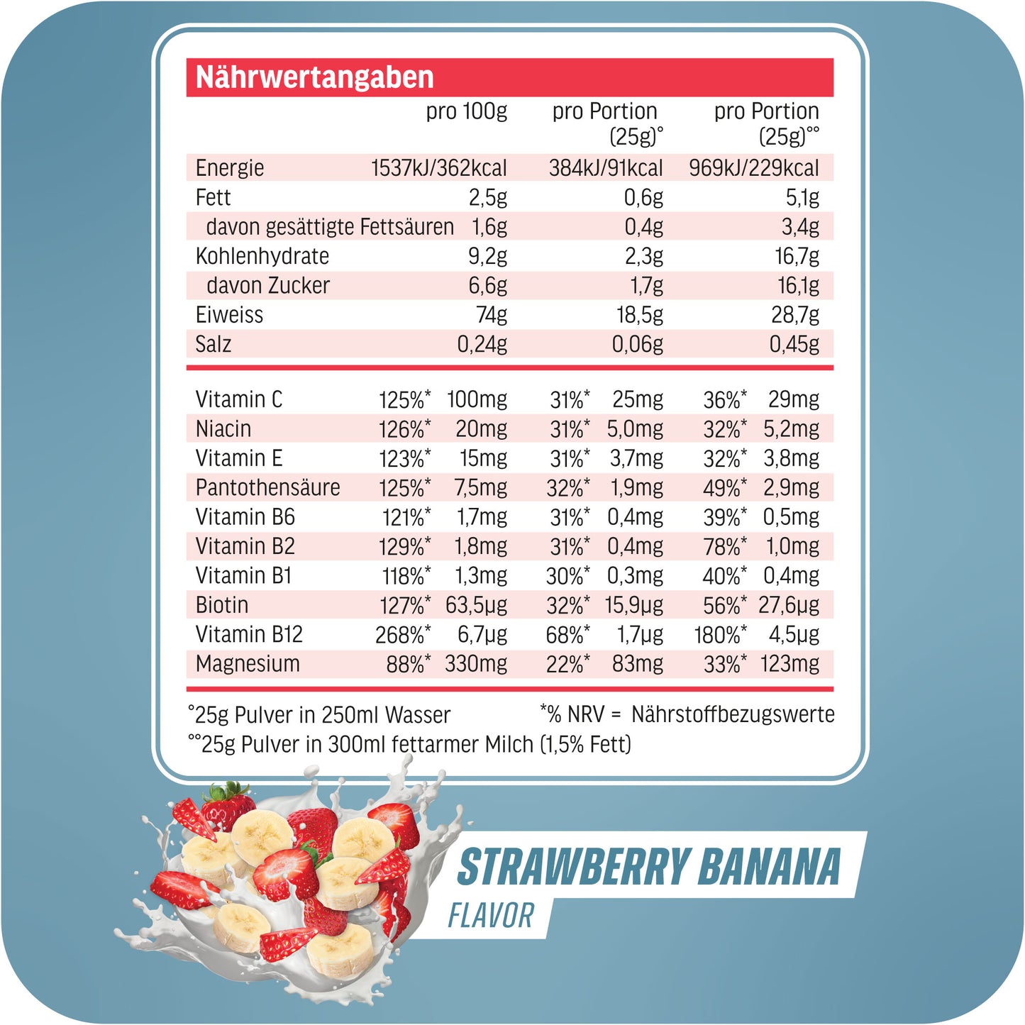 25g Pulver (1 Messlöffel, in der Dose) mit 300ml fettarmer Milch oder 250ml Wasser in einem Shaker mixen. Nicht mit elektrischem Mixer zubereiten – zerstört die leckeren Fruchtstückchen. PROTEIN Deluxe ist ideal als Zwischenmahlzeit oder nach dem Training.