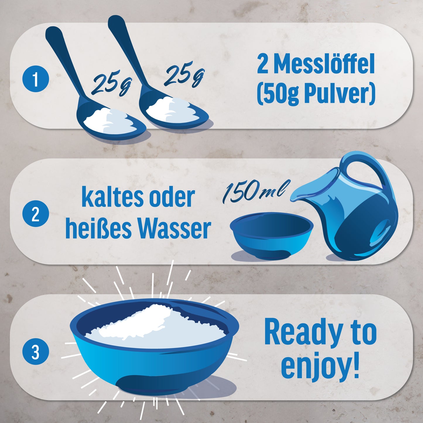 50g RICE PUDDING (2 Messlöffel) mit 150ml heißem oder kaltem Wasser vermengen und 2 Minuten ziehen lassen. Für leckeren Geschmack kannst du unser FLAVOR POWDER, unsere FLAVOR DROPS oder frisches Obst ergänzen. Geniesse deinen RICE PUDDING warm oder kalt zum Frühstück, als Zwischenmahlzeit, vor oder nach dem Training.