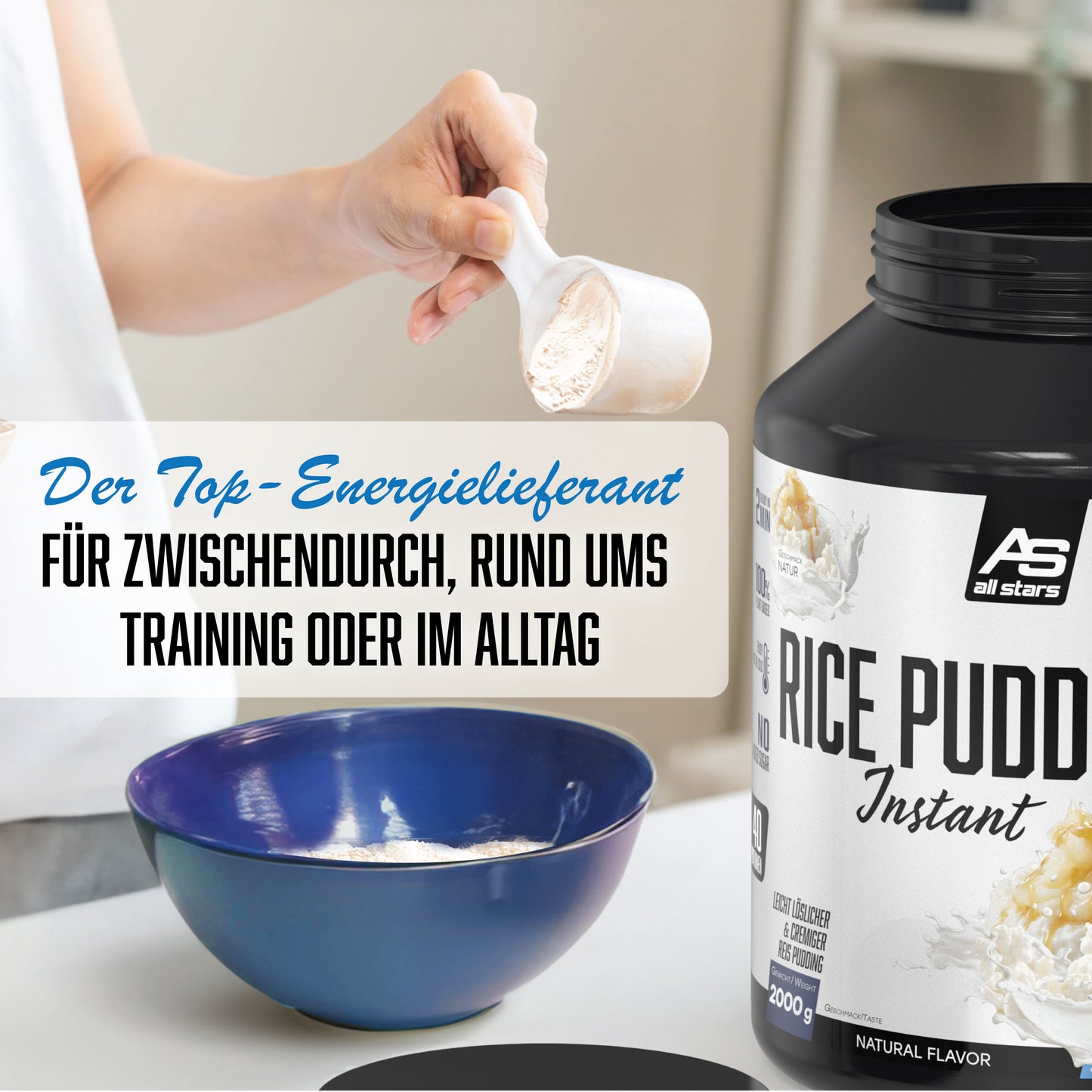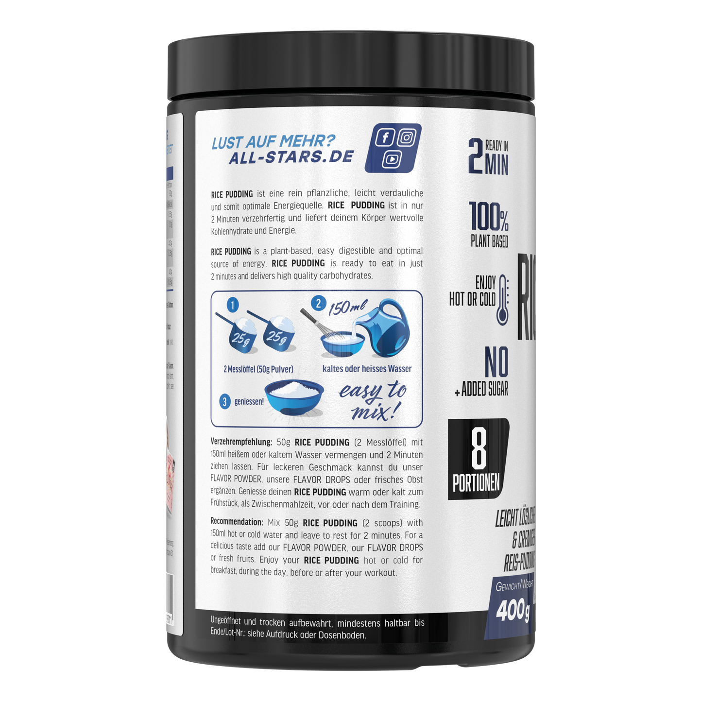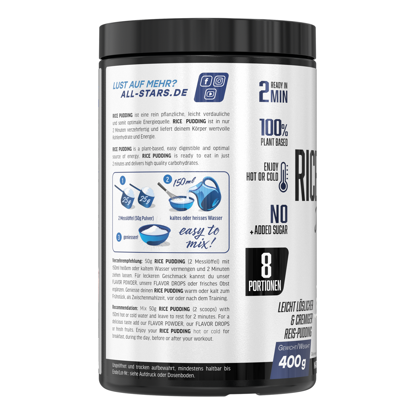 Du suchst einen schnellen Energielieferanten? Der satt macht, gut bekömmlich ist und den Körper nicht belastet? Dann bist Du mit dem neuen Rice Pudding (Instant) sehr gut bedient. Egal ob es zusätzliche Kalorien für die Massephase sein sollen, einfach schnell Energie für ein nächstes Meeting oder die anstehende Trainingseinheit benötigt wird oder Du den kleinen Hunger zwischendurch stillen möchtest, der All Stars Rice Pudding (instant) passt perfekt. Durch die schnelle und problemlose Zubereitung lässt er sich schnell und einfach genießen. Probier’s aus – pur oder mit Deinen Topping-Favoriten.