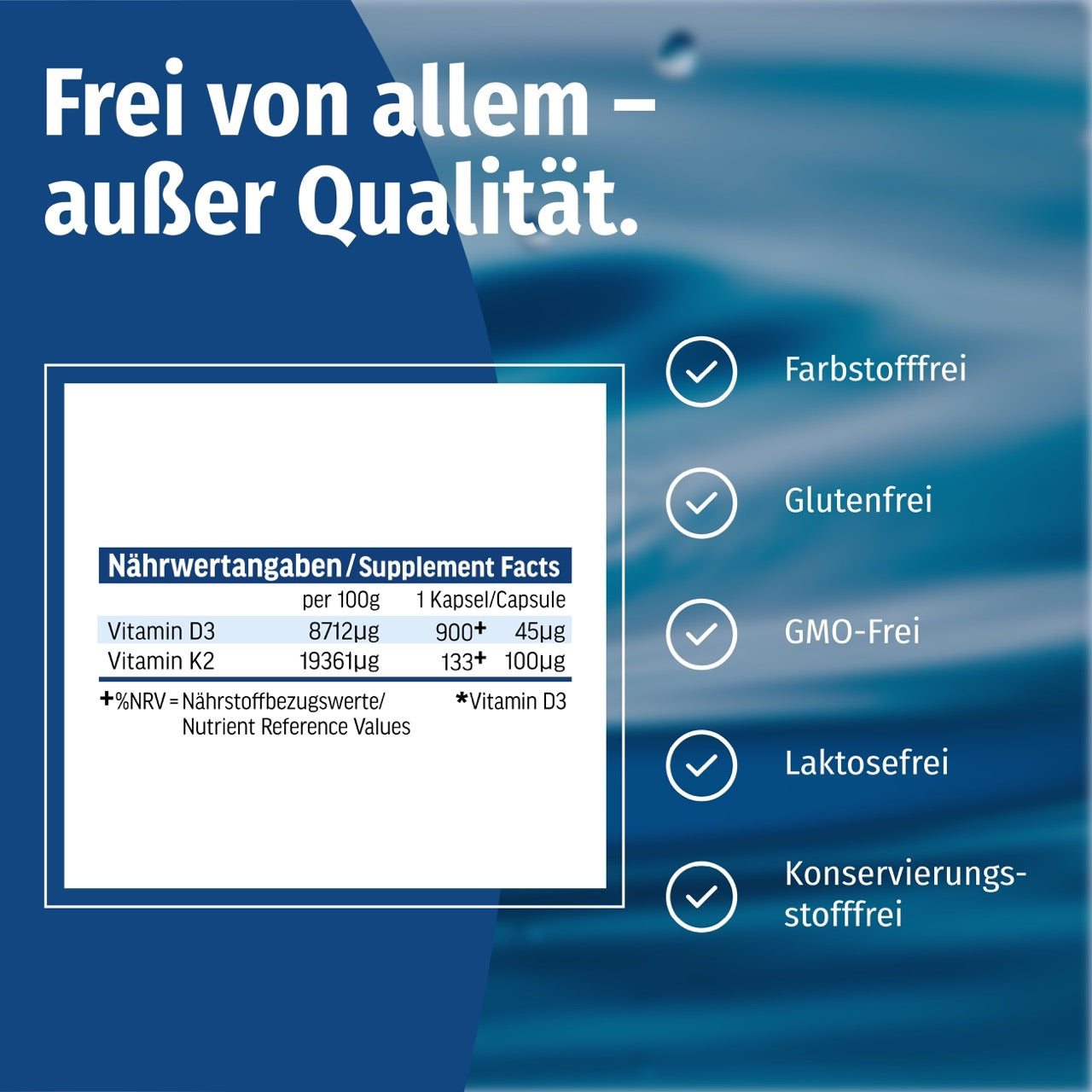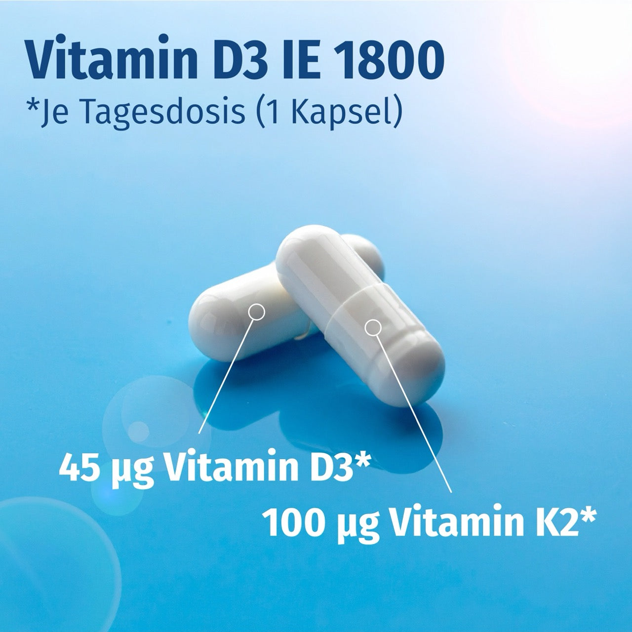 Gelatinefreie Kapseln mit dem Sonnenvitamin D3 und dem Vitamin K2.