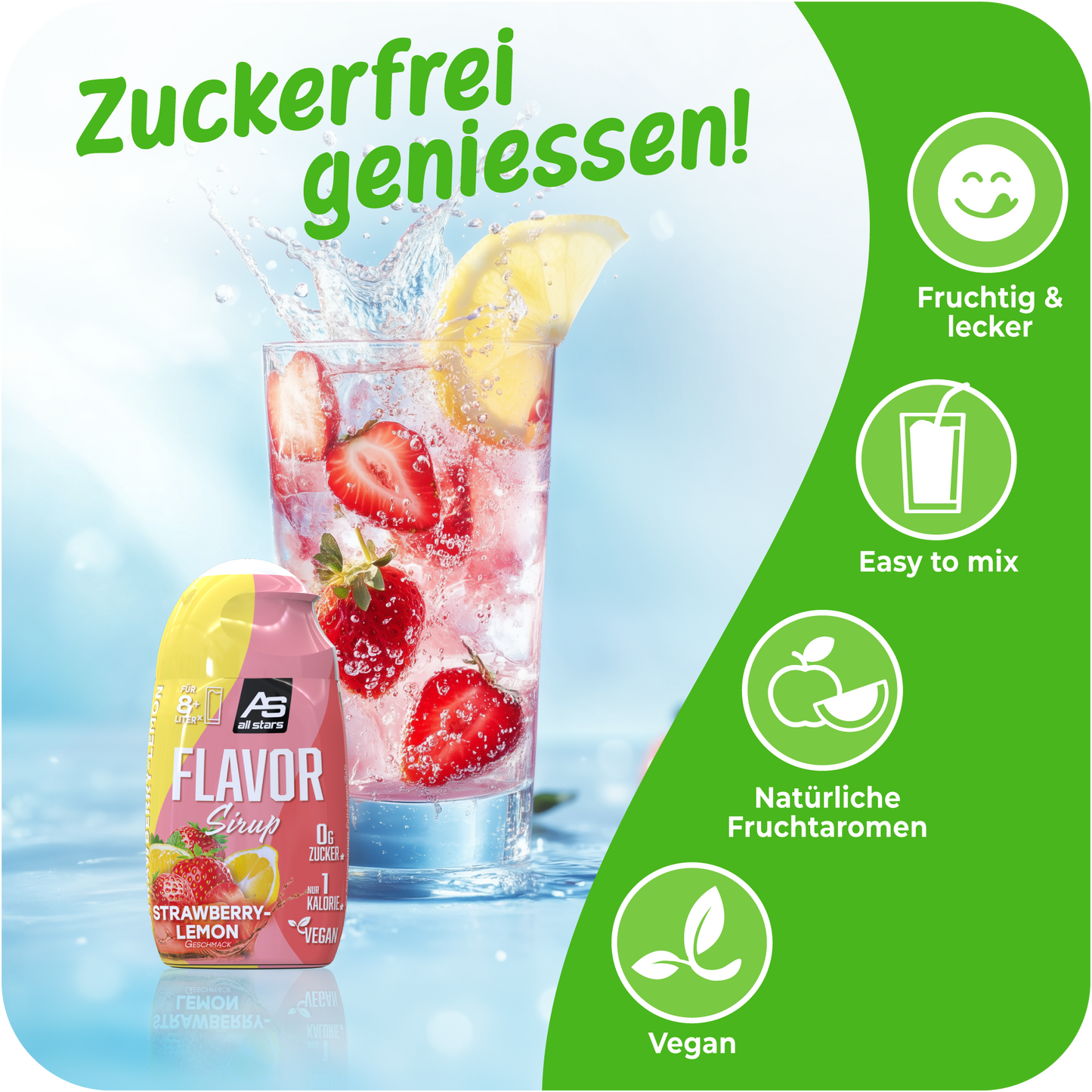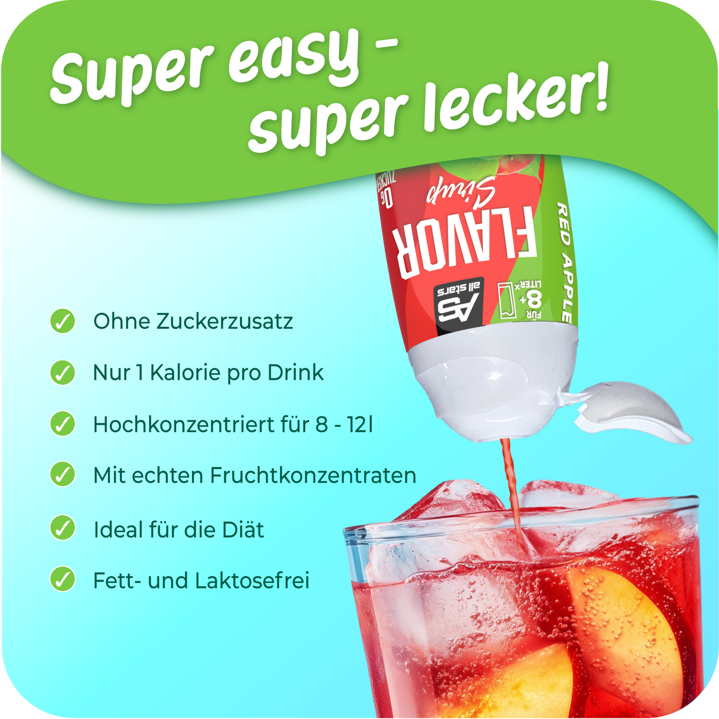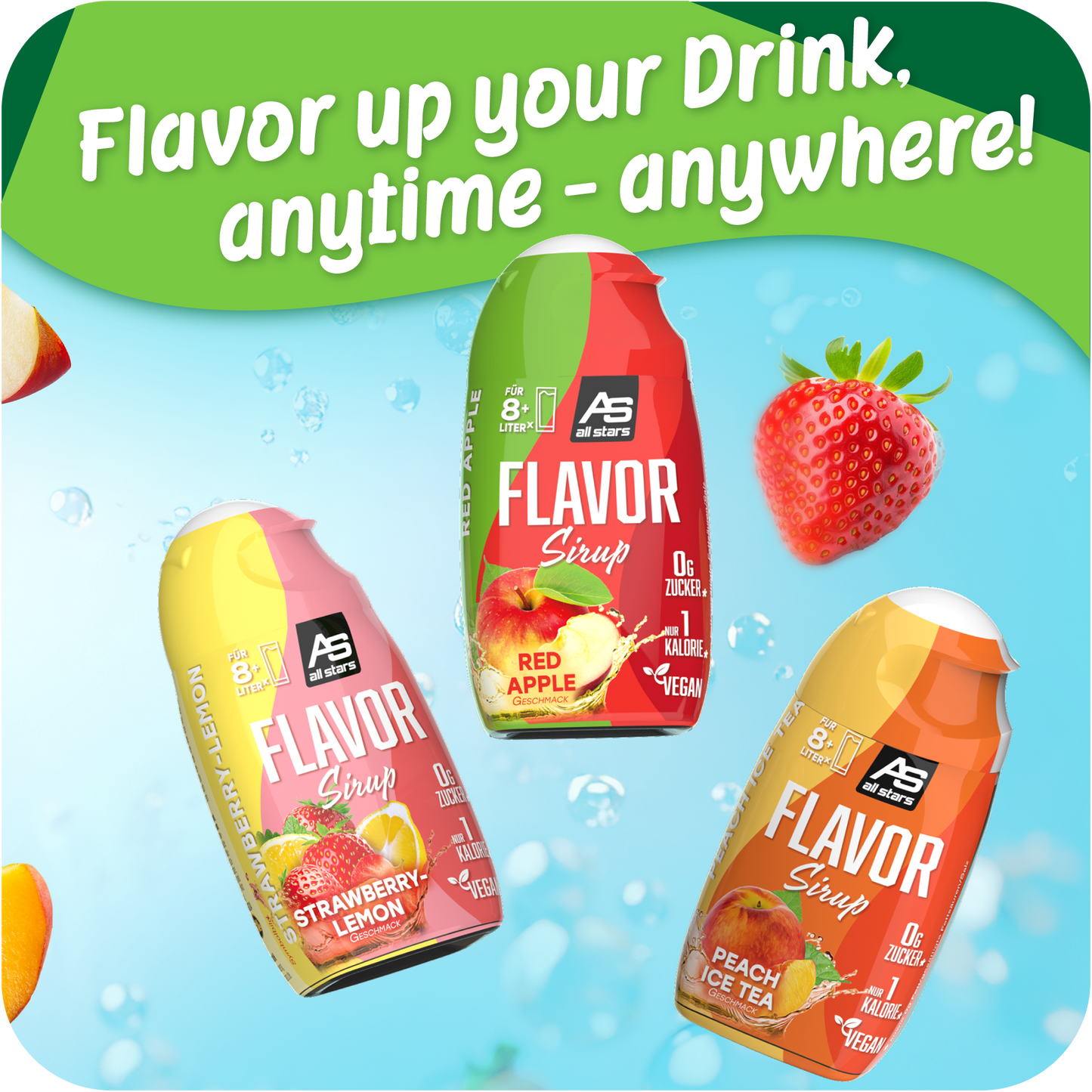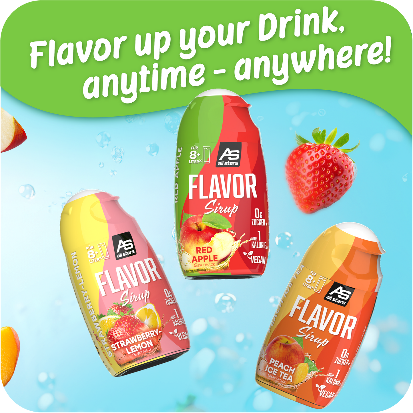 ALL STARS Flavor Sirup enthält weder Fett, Kohlenhydrate noch Zucker, ist hochkonzentriert und lässt sich mit stillem oder kohlensäurehaltigem Wasser ganz einfach zu einem leckeren und erfrischenden Getränk mischen.