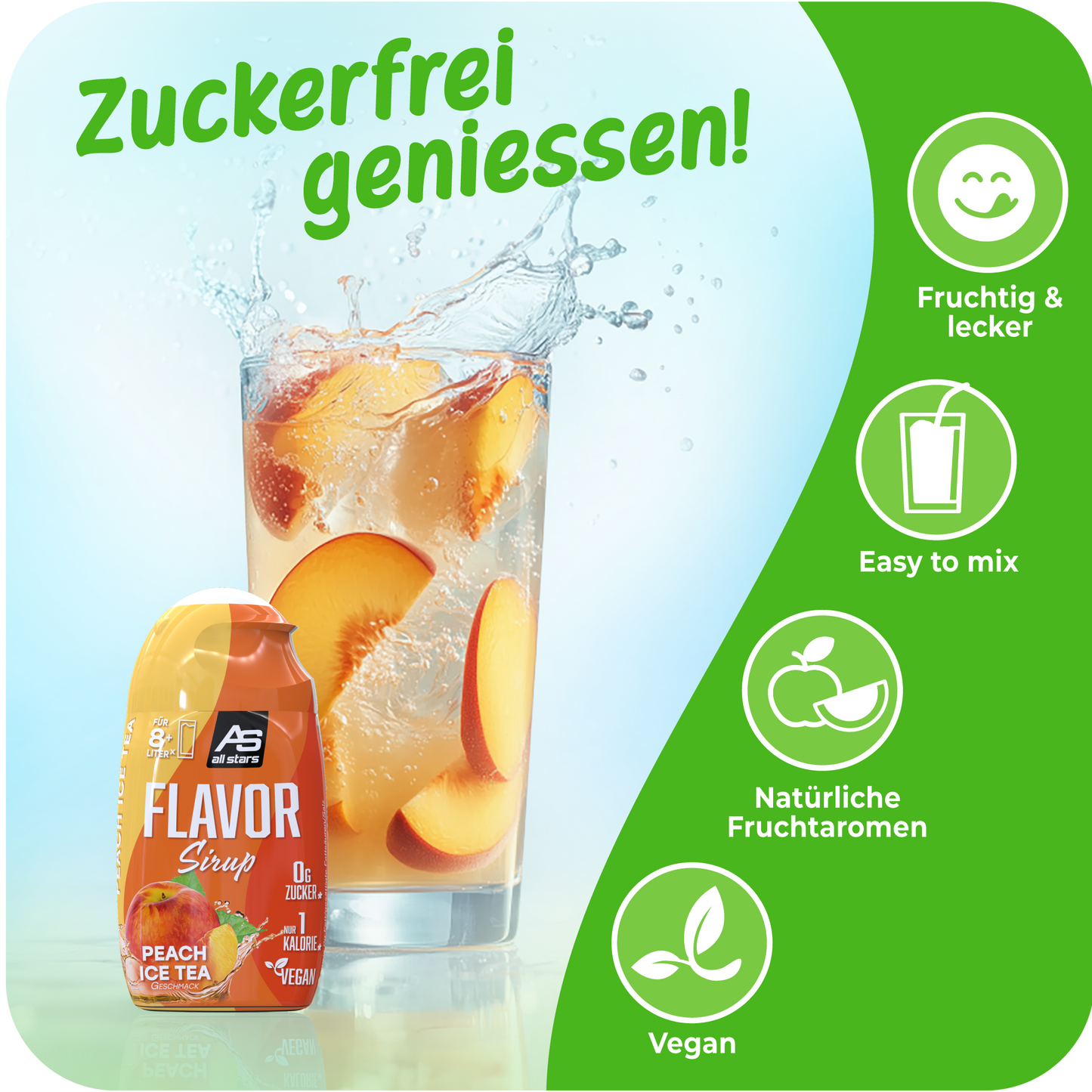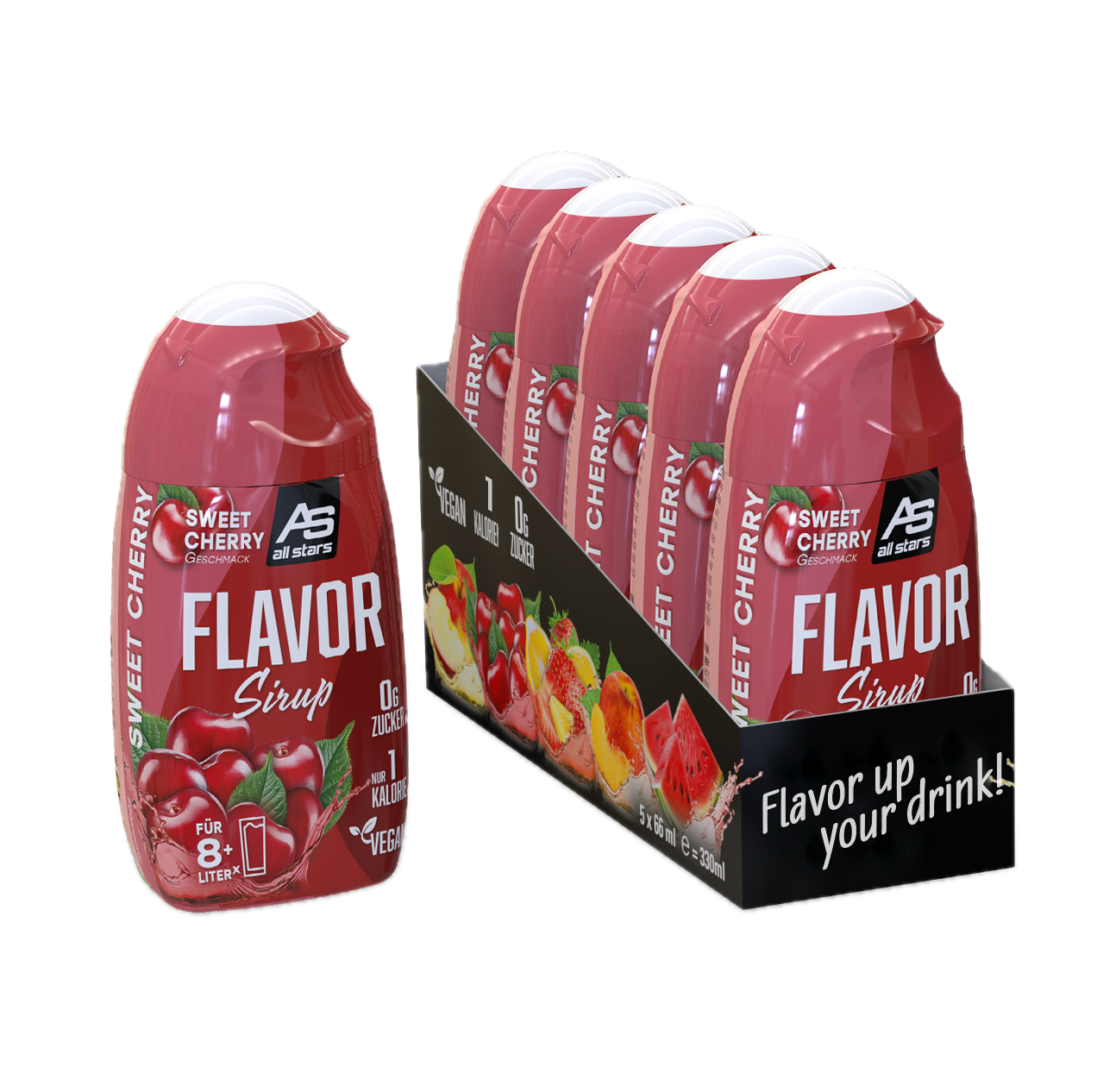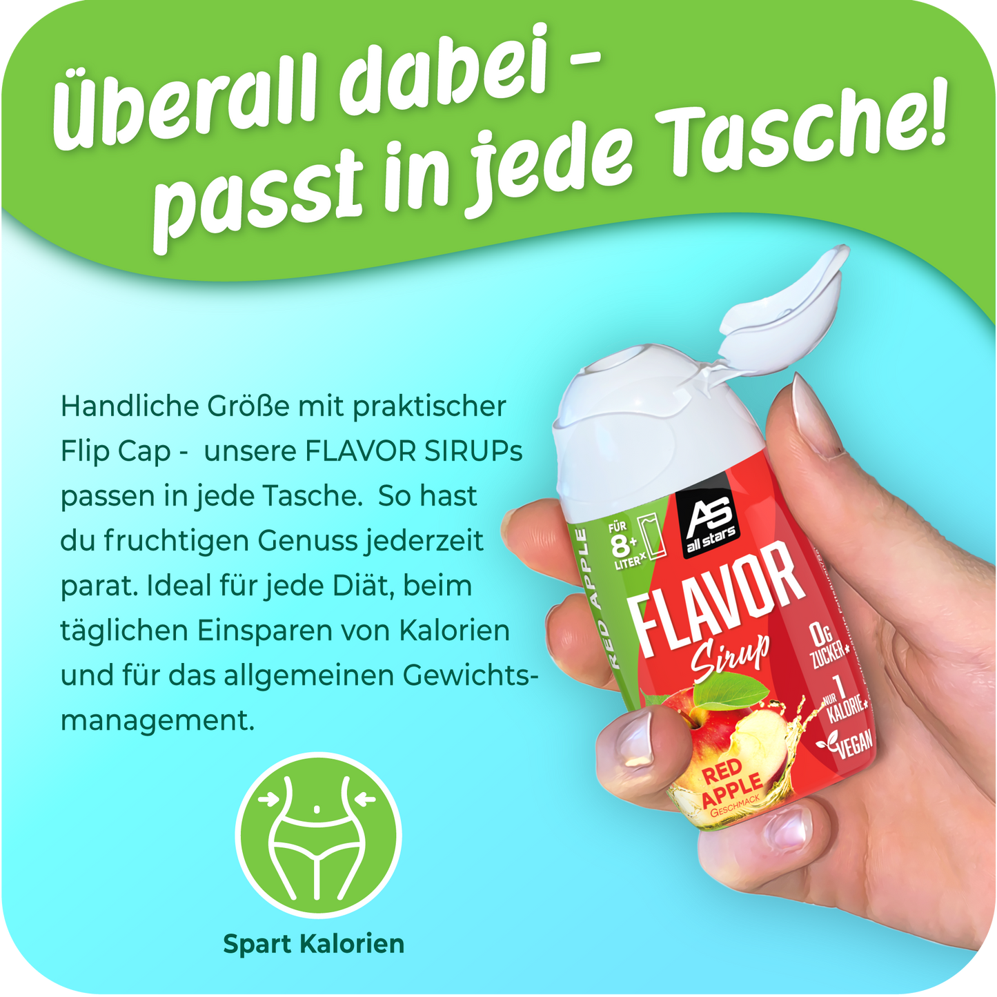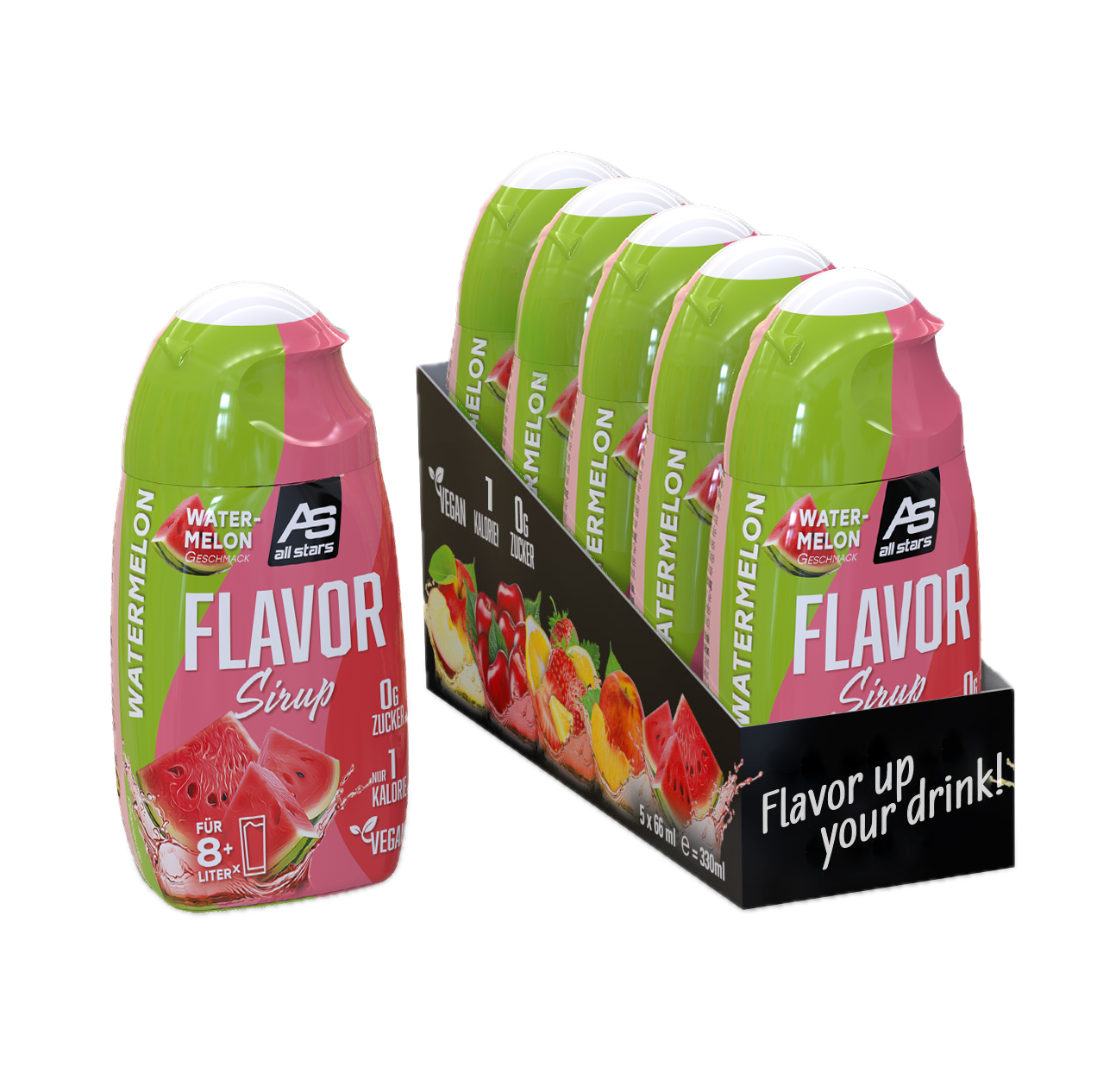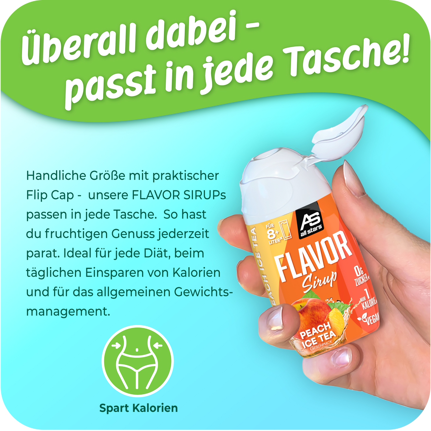 ALL STARS Flavor Sirup enthält weder Fett, Kohlenhydrate noch Zucker, ist hochkonzentriert und lässt sich mit stillem oder kohlensäurehaltigem Wasser ganz einfach zu einem leckeren und erfrischenden Getränk mischen.