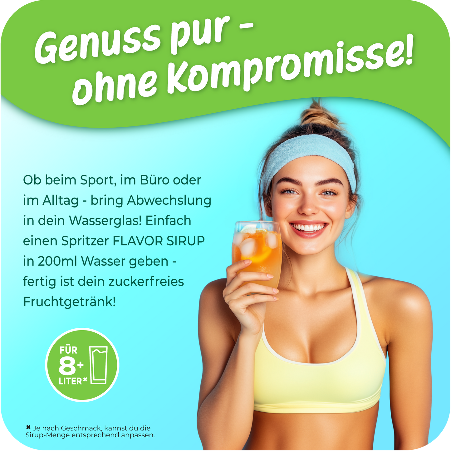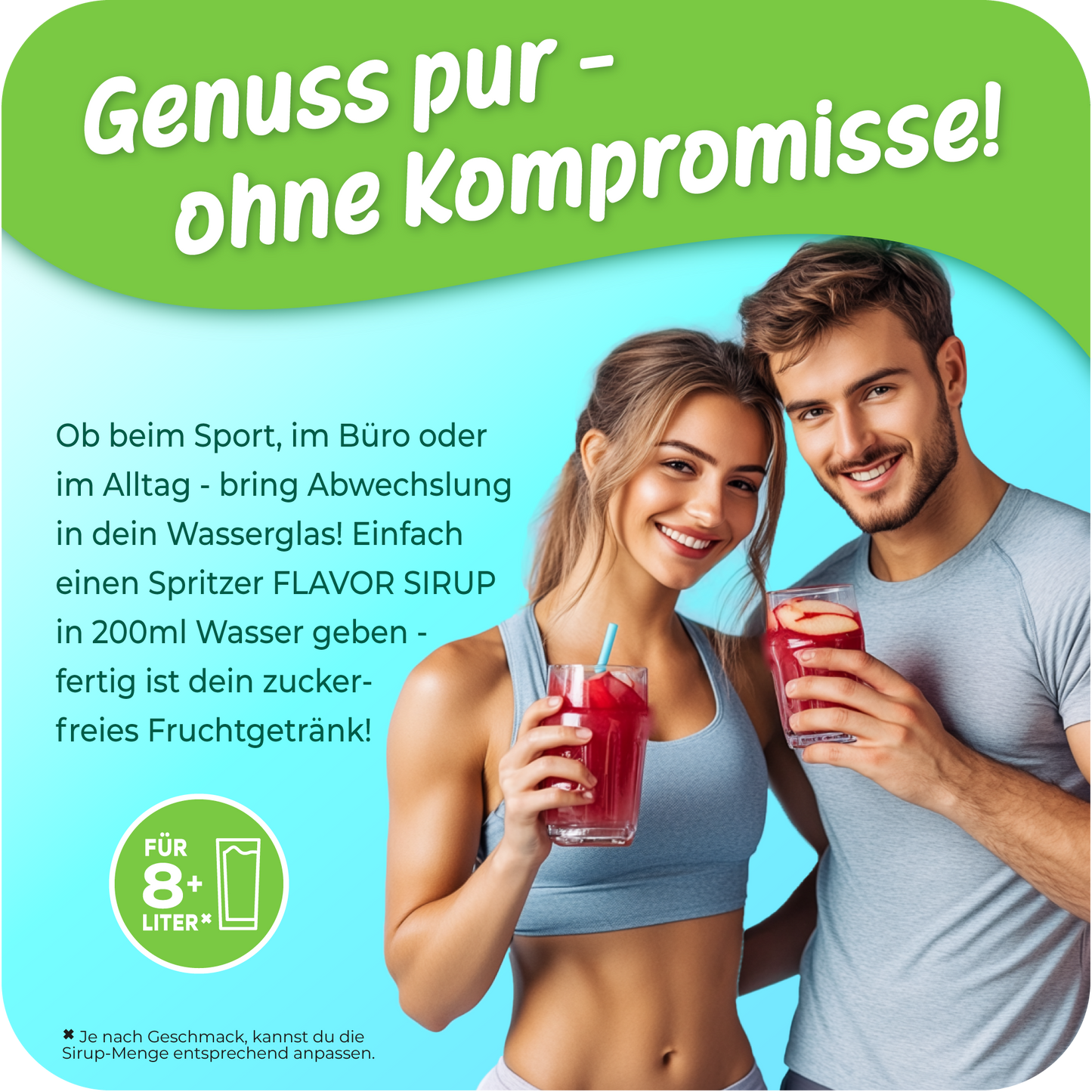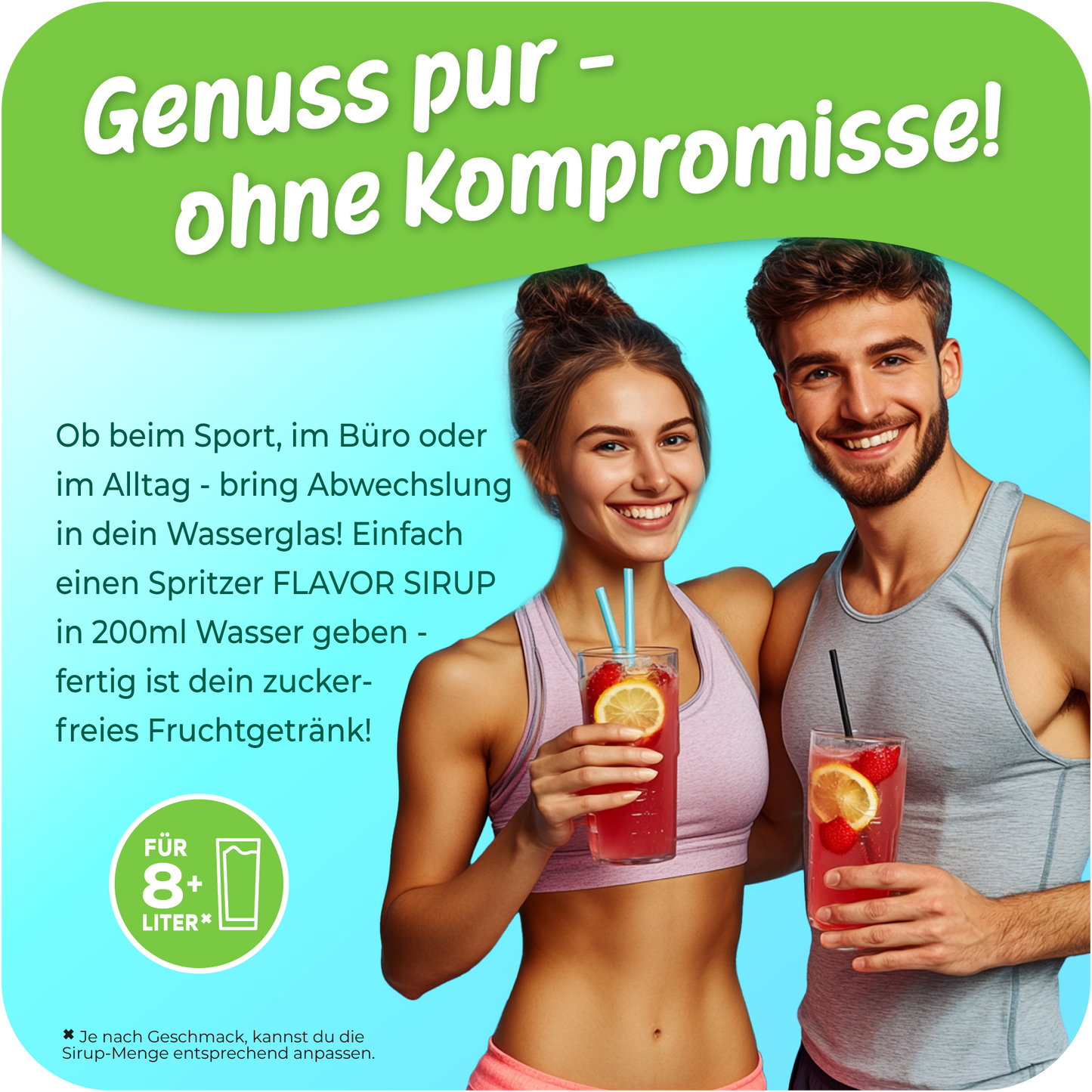 Aus 2 ml Flavor Sirup und 248 ml Wasser (still oder mit Kohlensäure) kannst Du Dir schnell und unkompliziert ein leckeres, erfrischendes Getränk mischen – bei nur 2 kcal je 250 ml Portion, ohne Zucker- und Fettanteil.