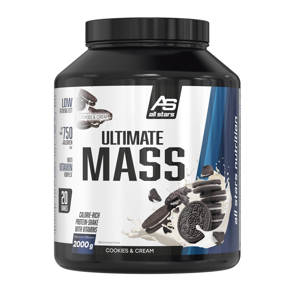 Ultimate Mass ist ein Weight Gainer für die Massephase, der reichlich zusätzliche Kalorien liefert und 3 leckeren Geschmacksrichtungen (Schoko, Vanille, Cookies Cream) zu haben ist. In solchen Phasen wird, durch das Zuführen von mehr Kalorien als dem reinen Tagesbedarf, Masse aufgebaut, die durch gezieltes Training in Muskelmasse umgebaut werden kann. Das langfristige Ziel ist daher nicht der reine Massezuwachs, sondern größere und kräftigere Muskeln.