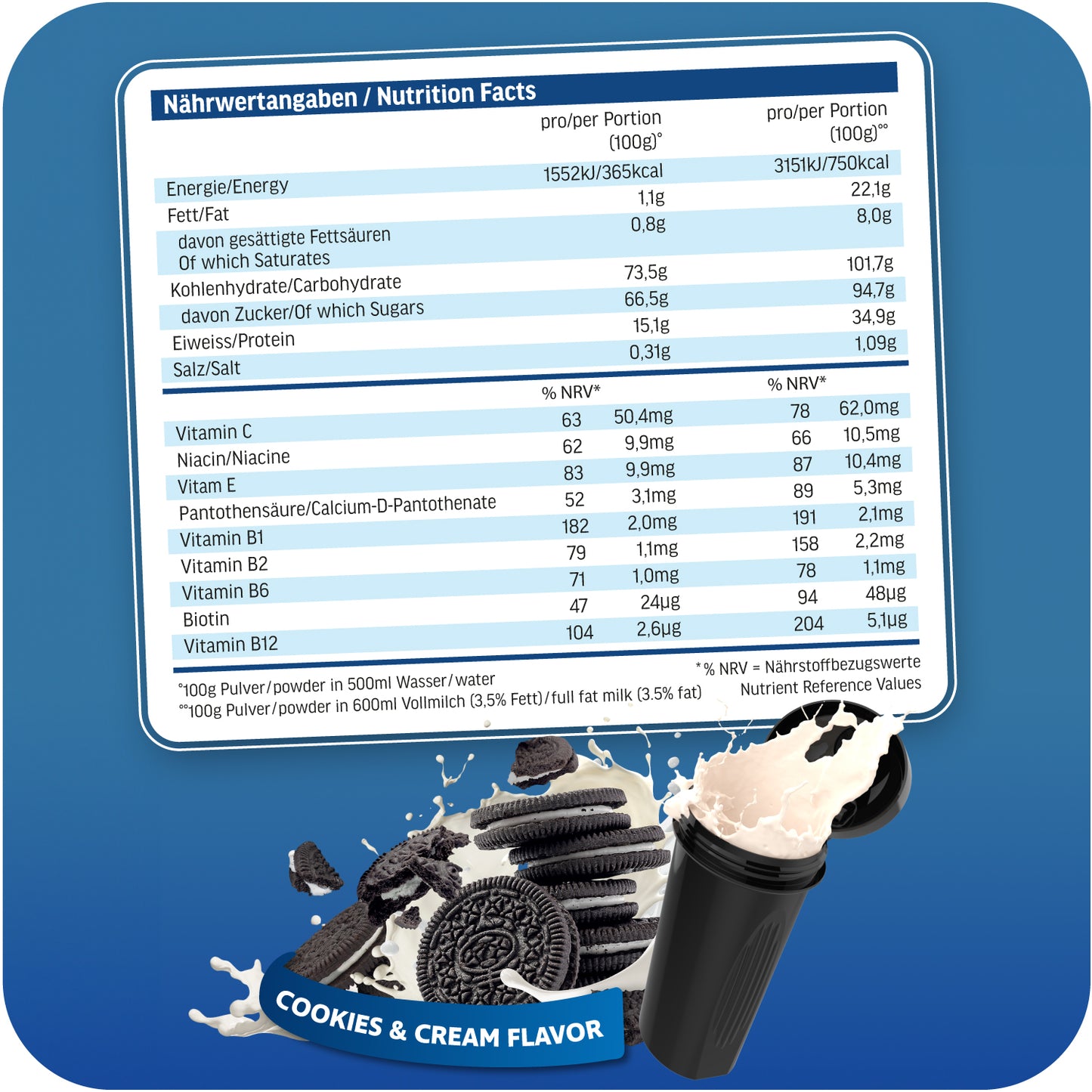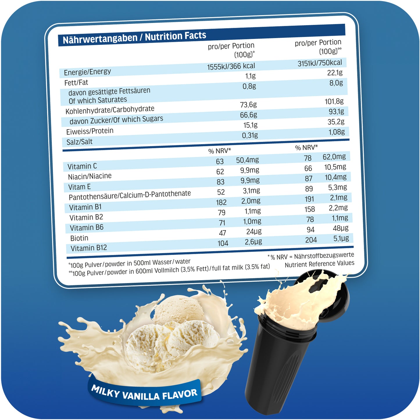 Die enthaltenen Kohlenhydrate setzen sich vorwiegend aus Dextrose und Maltodextrin zusammen. Wheyprotein-Konzentrat liefert das Protein.