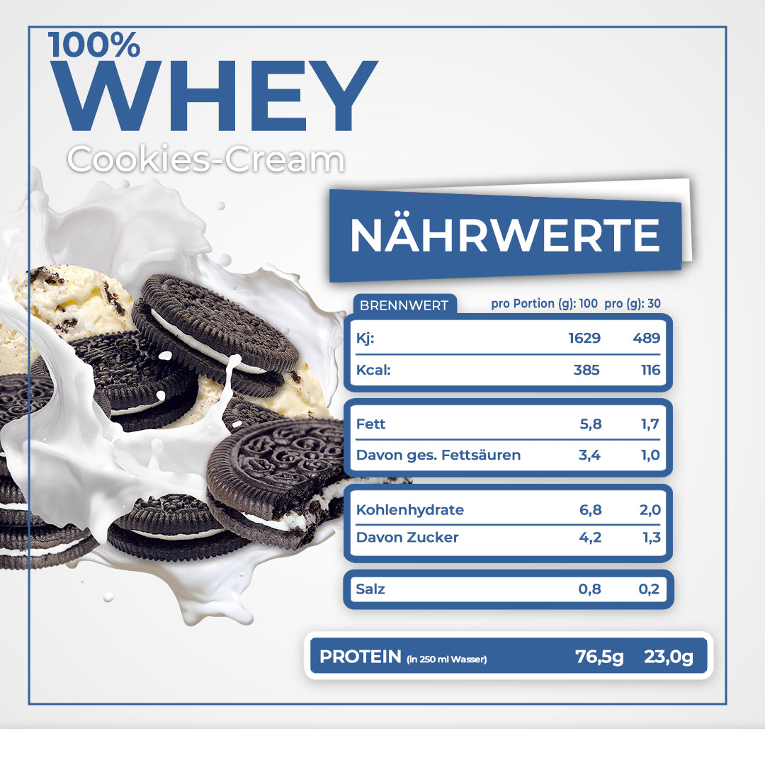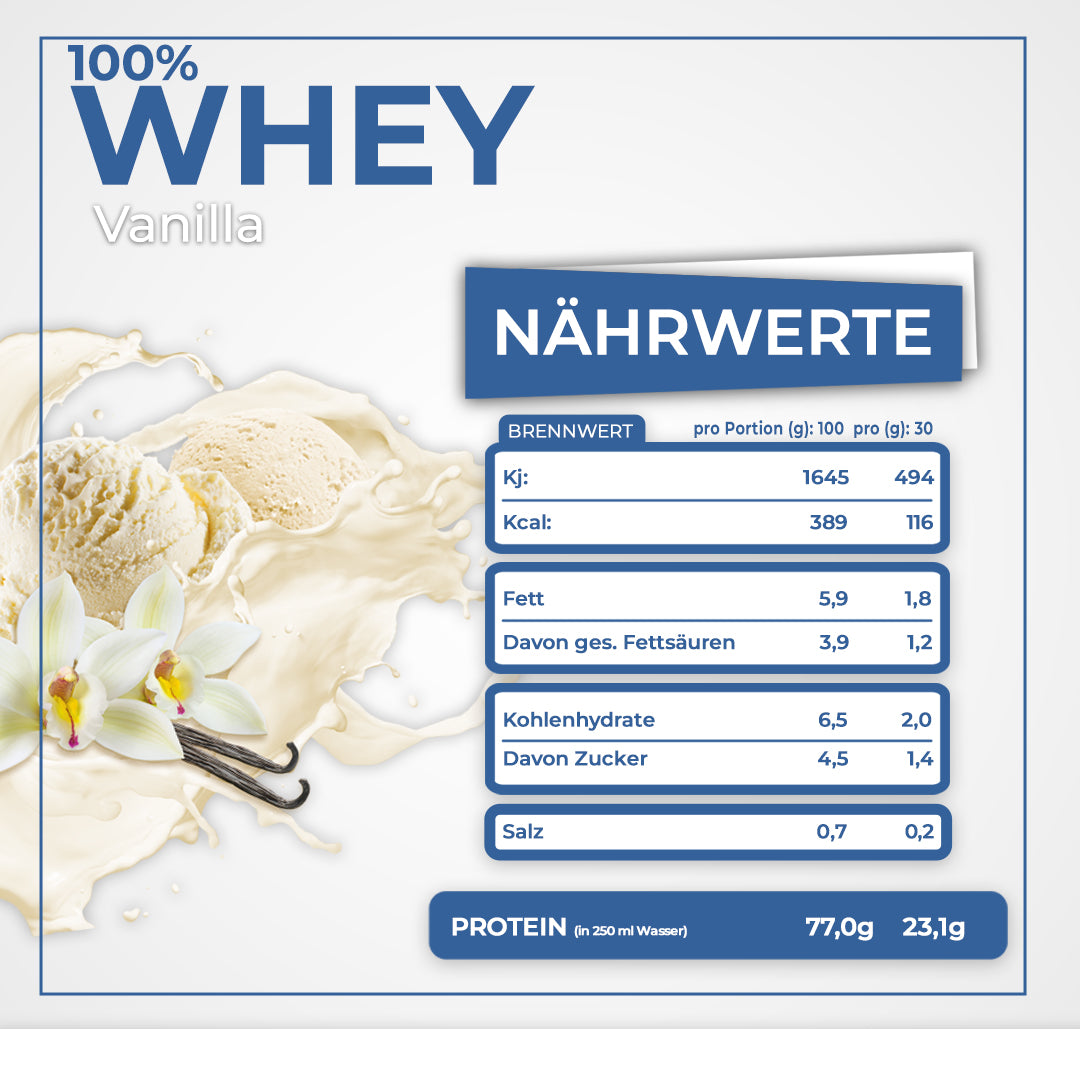 Das Whey Protein enthält mit Molkenprotein-Konzentrat und hochreinem Molkenprotein-Isolat zwei sehr hochwertige Proteinarten. Jeder Shake aus 30g Pulver und 250ml Wasser (oder 300ml fettarmer Milch) liefert mehr als 20g Protein (mit Milch gemischt sogar mehr als 30g), bei wenig Fett, kaum Kohlenhydraten und Zucker.