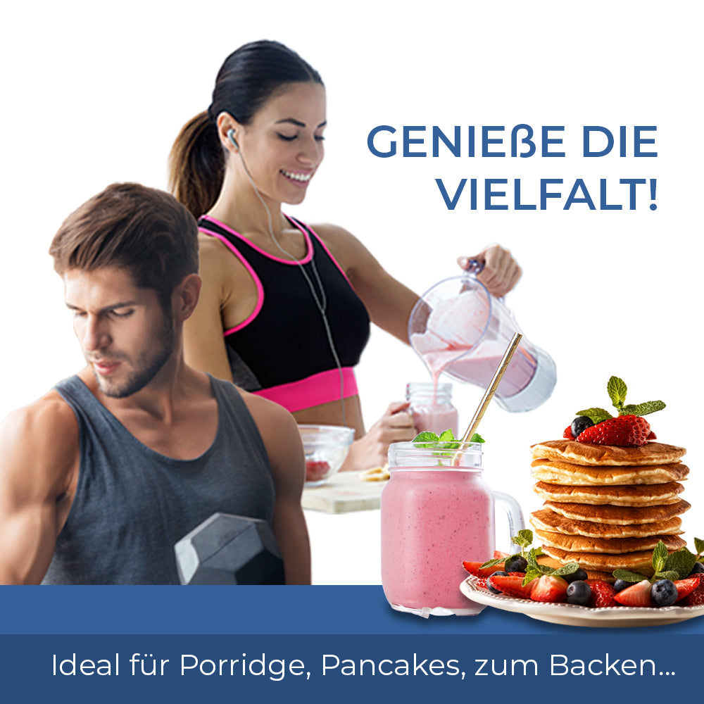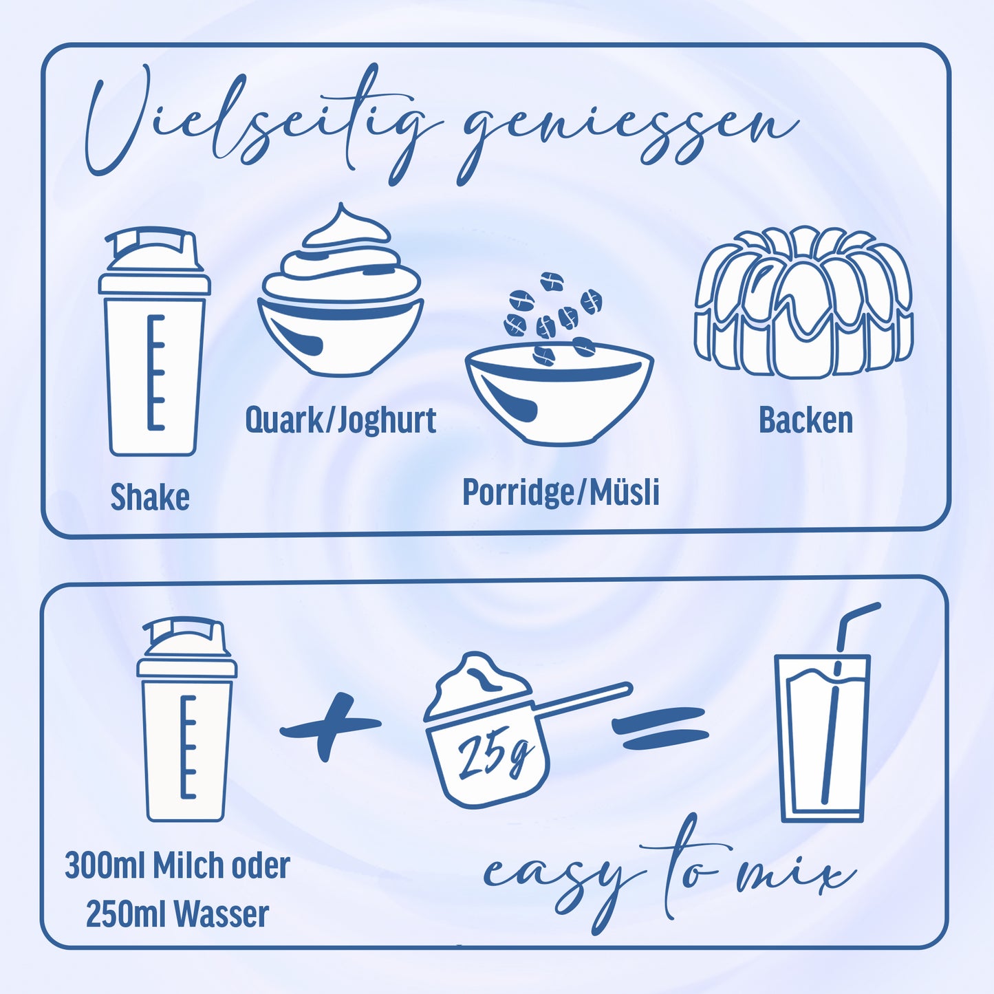 Du kannst das Whey Protein sehr vielfältig nutzen. Neben der Verwendung mit Wasser oder fettarmer Milch als Shake, kann das Pulver auch zum Backen genutzt, zu einem morgendlichen Porridge oder Müsli zugefügt oder in Quark oder Joghurt eingerührt werden. Es eignet sich in jeder Form zur Anreichung der Proteinversorgung über den Tag verteilt, am Morgen nach dem Aufstehen, abends vor dem Schlafengehen oder rund ums Training.